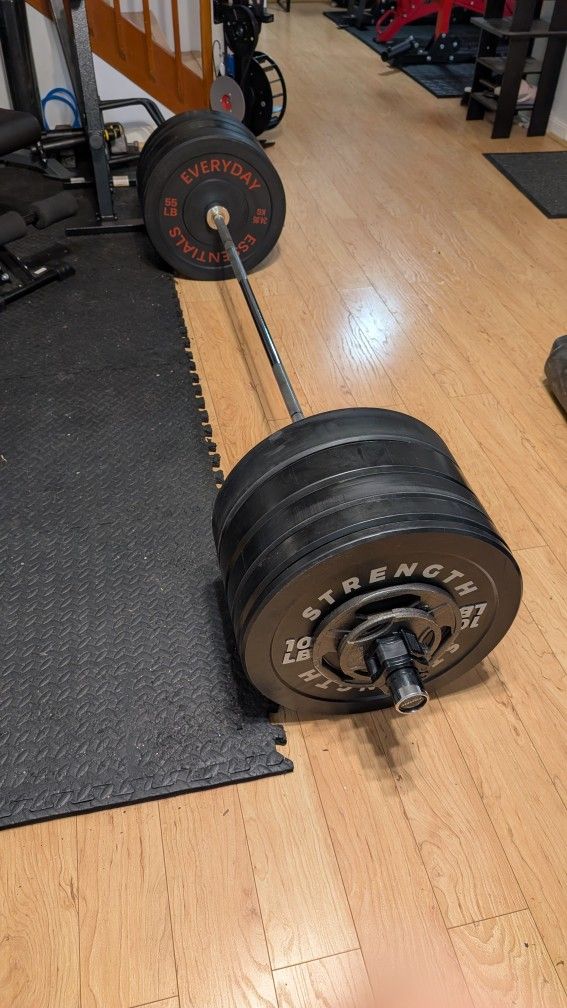 355 lbs of bumper plates (5 lbs and 2.5 lbs are iron) and a Ritfit Elite 7' Olympic barbell with bar clamps. Plate pairs included = 2.5, 5, 10, 25, 35, 45, and 55 lbs exercise fitness health weight strength training home gym equipment weights dumbbells dumbells workout work out pesas mancuernas libras muscle cardio wellness
