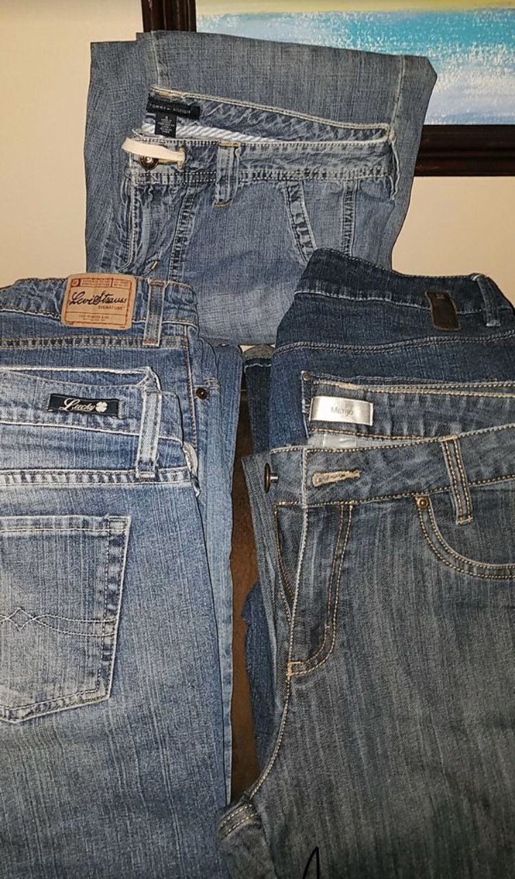 1 pair of Lucky Capri's, 1 pair of Tommy jeans Capri's, 1 pair of Metro 7 jeans, 1 pair of Levi Strauss jeans, and 1 pair of Jag jeans Capri's.