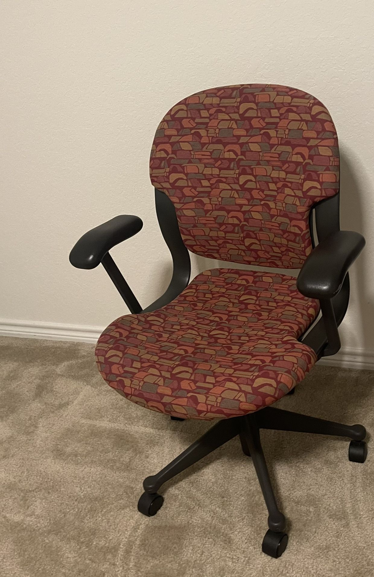 Not a high back chair. Adjustable height. Cloth material. No delivery or shipping. Must pick up.