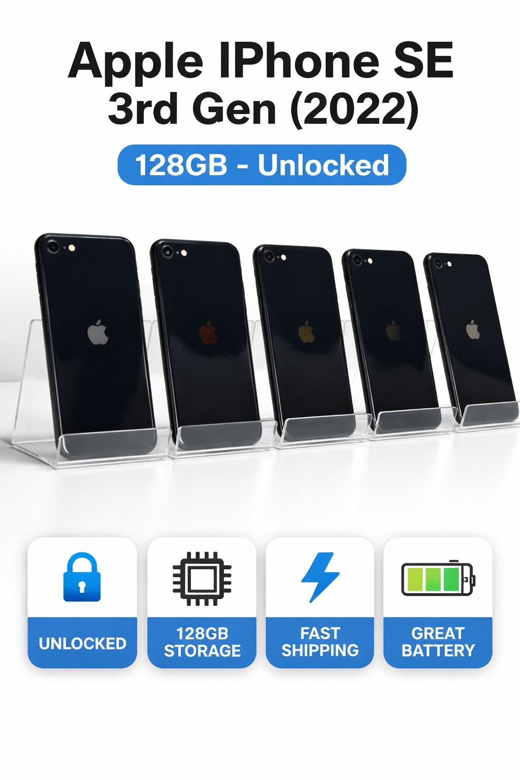 Apple iPhone SE 3rd Gen 128GB in Midnight. Factory unlocked and ready for use with your preferred carrier. Fast shipping. Includes: • iPhone SE 3rd Generation • 128GB storage • Color: Midnight • Unlocked Condition: Pre-owned. Please review all photos carefully for cosmetic condition. Device powers on and is ready for activation. Great for anyone looking for a compact iPhone with solid performance, 5G capability, and 128GB of storage. Price per unit $185. If you’d like to purchase more than one please message us! We’d love to work something out for you.