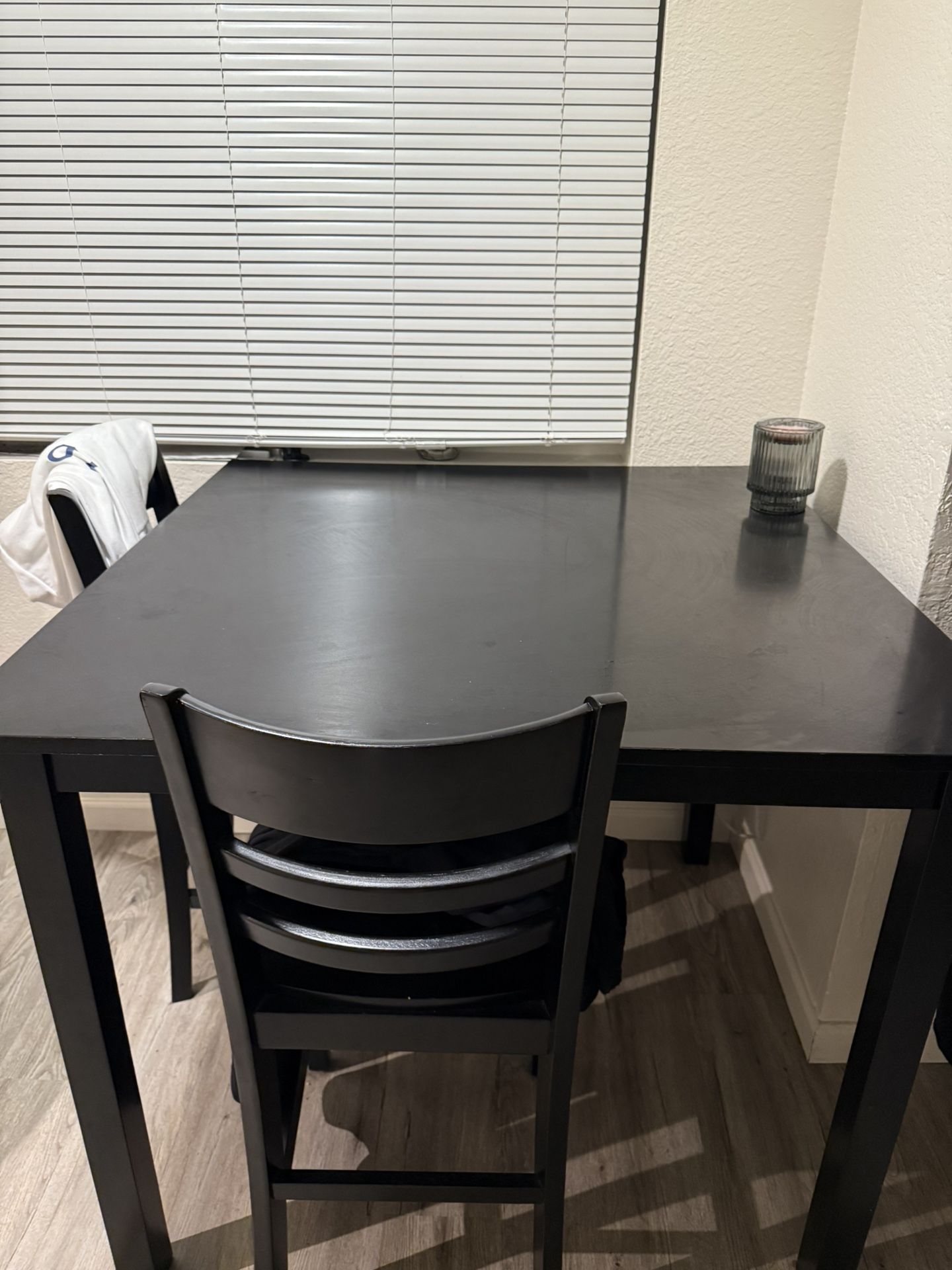 Black tall kitchen table . It has 4 chairs total. The other two are just in the storage closet. 150$