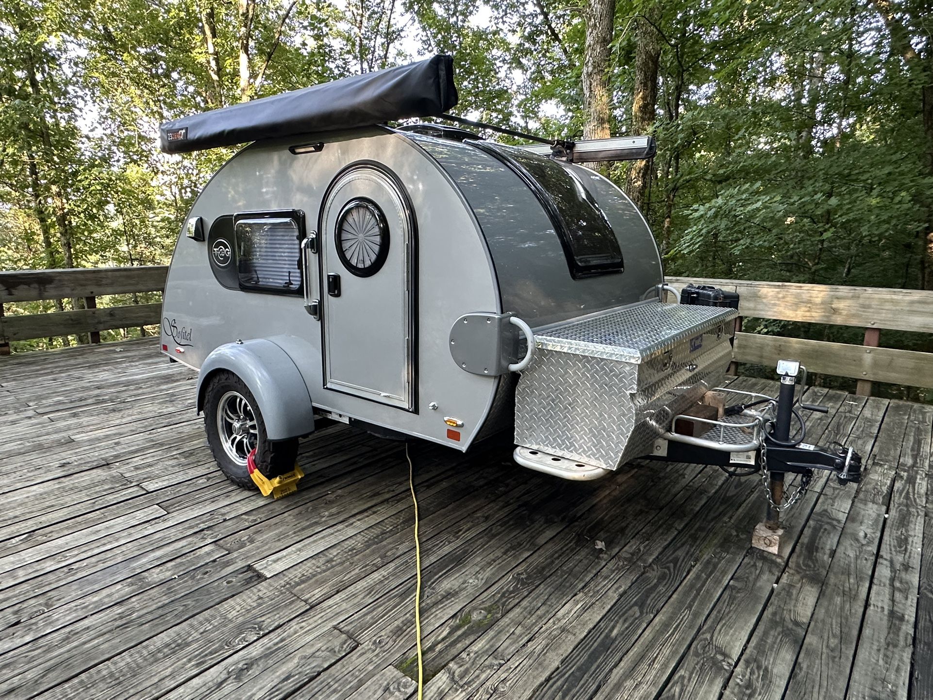 The rig is winterized and has been in inside storage since mid-October. It can still be shown but we will need a slight bit more notice prior to showing, as it is not stored at our residence. This camper was ordered without the TV or a microwave option which gives you extra cabinet space in the galley. Also ordered the additional light bar in the galley, aluminum rocker trailer tongue, and the roof rack that at the time was only offered with the Boondock Edition. The galley includes the Norcold refrigerator/ or freezer (not dual zone)which NuCamp has since replaced in the newer addition tags with a cooler. We have had zero issues with the appliance maintaining temperature when used as a refrigerator. It was never used as a freezer. The light bar is attached to the galley hatch door. The galley hatch door does have a small area damaged from a too tall item being placed in the storage shelf. It could be easily covered. We just never did so. When not in use, no matter the season, this camper has been stored in a garage. During our ownership of the trailer, we added the following modifications: 2 inch Dexter lift (think Boondock edition) Oversized BF Goodrich all-terrain tires Larger diamond plate toolbox to the front of the trailer Replaced original manual roof fan with an automatic MaxAir Installed 65 pound struts under the bed for easier access to storage Two 6V golf cart batteries to increase capacity (longer runtime) Under vehicle lights , set the color you want via app control and lights in the toolbox area Ordered matching solid color wing walls made by Meme Eberspacher in 2021, but wound up not installing them due to removal of the sink/cooktop combination Larger modifications: Removed sink/stove combination, and replaced with a laminate countertop that includes an extension down the middle (see pictures for reference) to increase counter space Installed a Camp Chef on demand water heater next to the toolbox for showers/dish, dishwashing needs A 23 Zero 180° awning is installed on the passenger side An ARB 2000 x 2000 awning has been installed on the drivers side. This awning includes a removable privacy screen room Included are: The original custom aluminum rim wheels, and tires The original cabin exhaust fan The original combination sink/cooktop with gas line connection The original aluminum diamond plate tongue box
