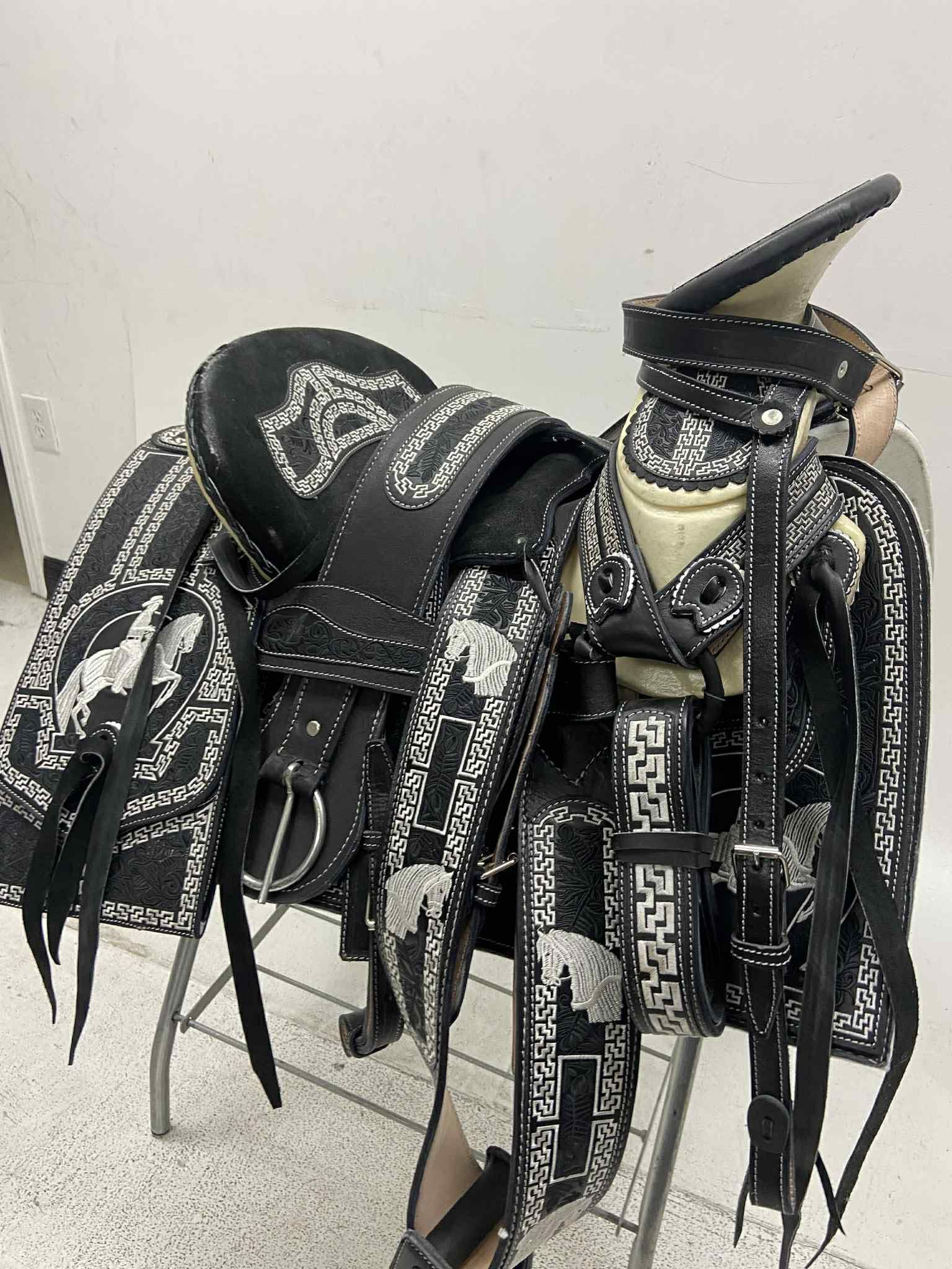 Montura de Piel 100% de la mejor calidad Hecha en México Bordada con preciosos diseños charros exclusivos, el precio ya incluye la cabezada, las Correas para las espuelas el cincho y la pechera todo bordados para qué combine con el resto de la montura lista para recoger o entregamos a domicilio, envía mensaje para más información