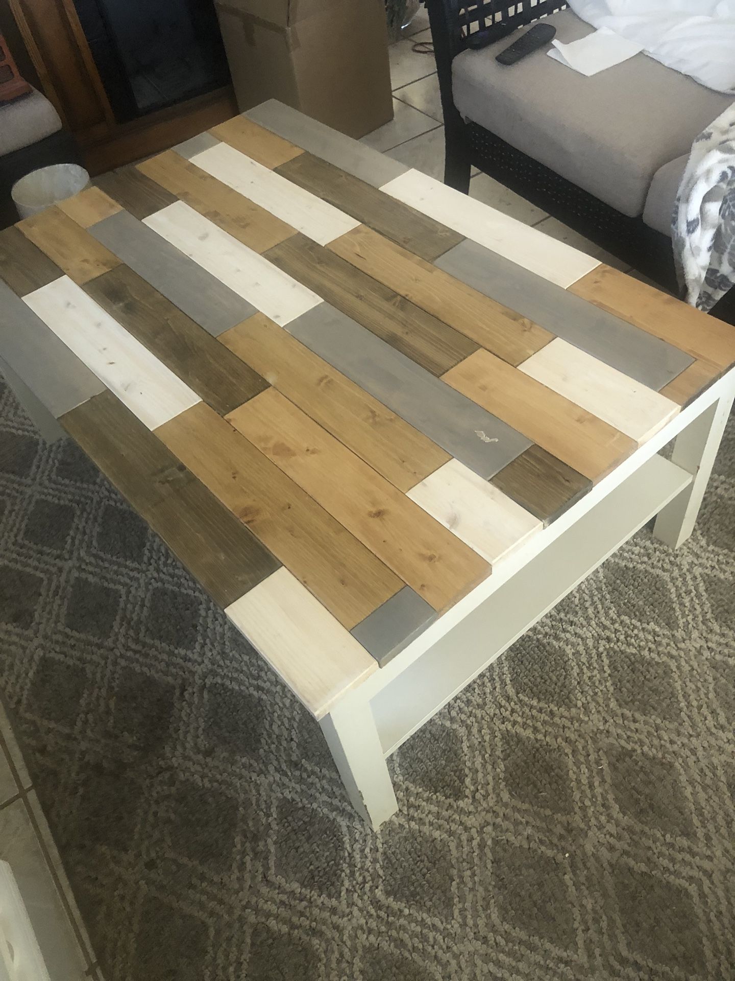 White wood with refurbished multi color table top- 46 long-32 wide and 18 1/2 height. With shelf on bottom of table