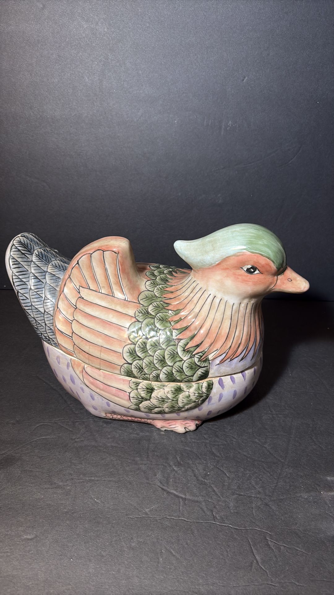 VTG Chinese Porcelain Famille Rose Chinoiserie Duck Food Tureen Center Piece L:11.5” H:8” Stunning