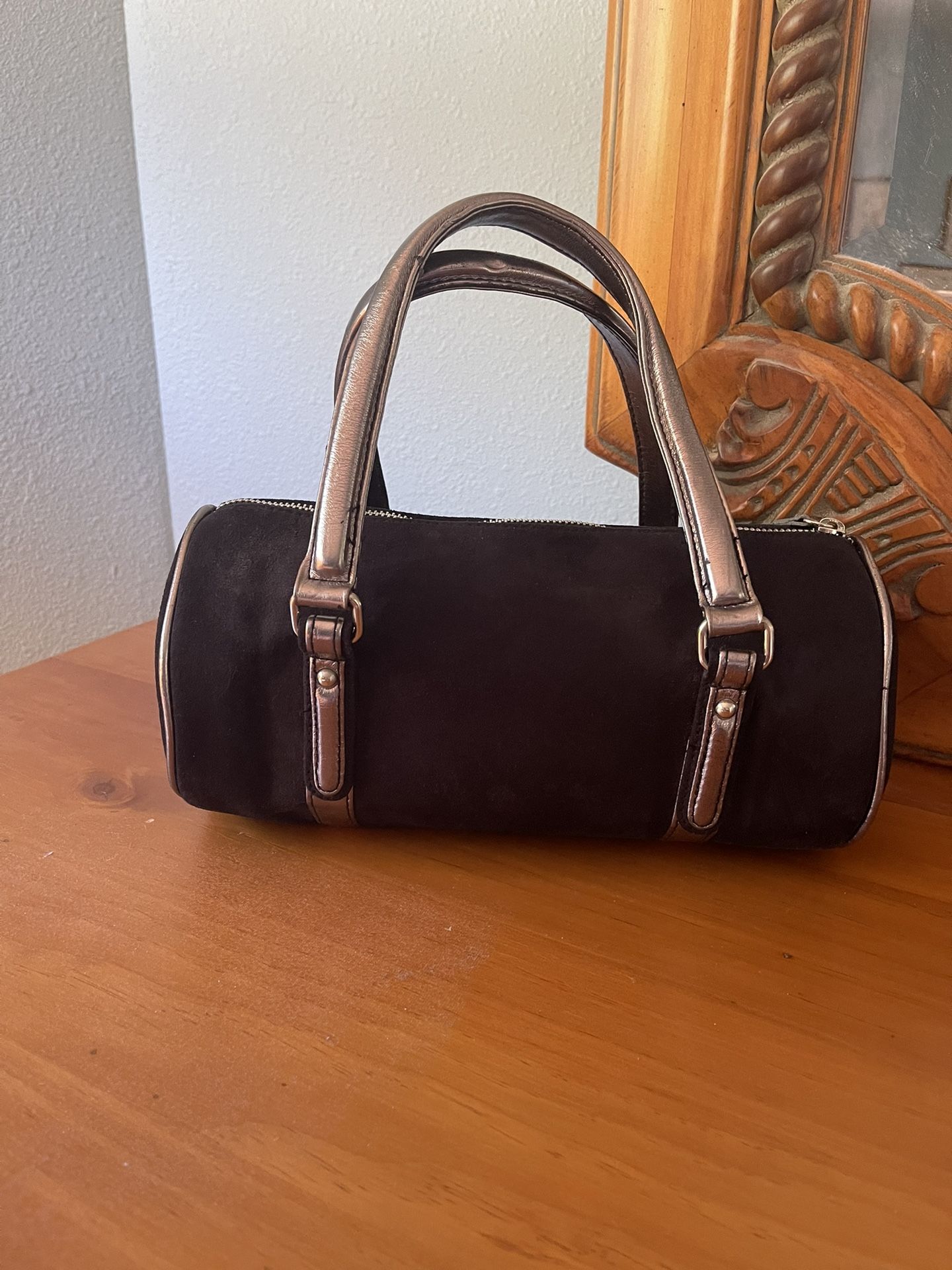 Great shape only carried a couple times silver accents, black suede, and silver leather. Dimensions are 10 x 5 x 5.