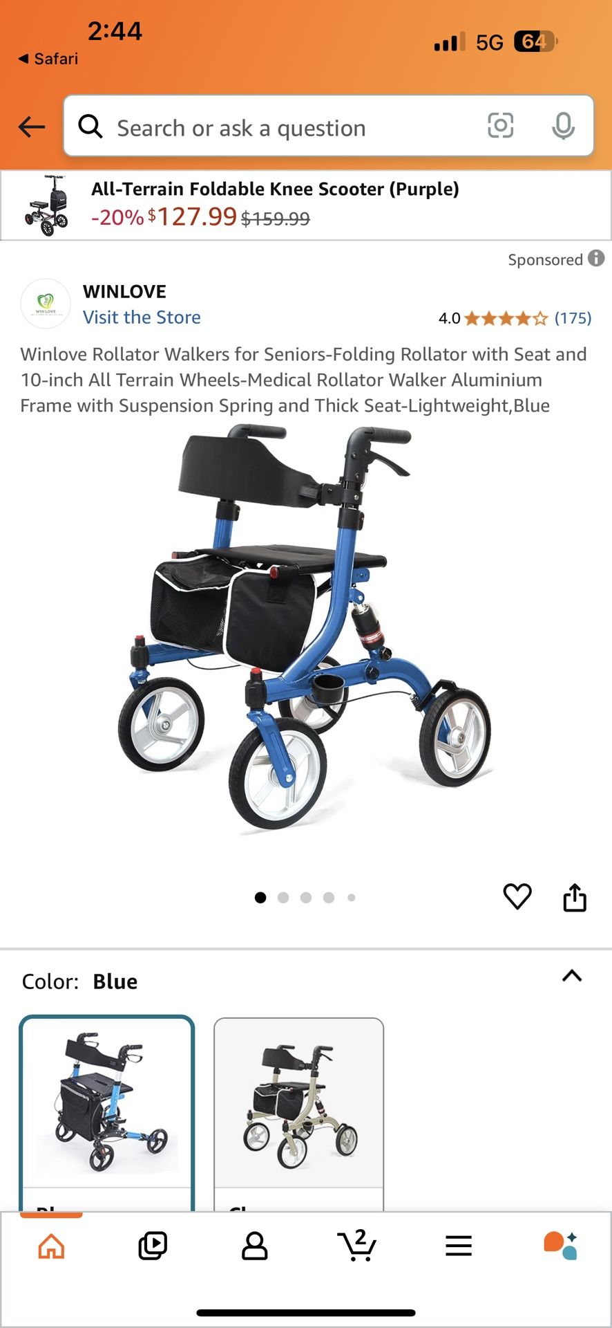 Folding rollator with 10-inch all terrain wheels, aluminum frame, and suspension spring. Lightweight, blue. Brand new box damaged I can put together if needed pick up Elk Grove Elk Grove florin rd and Calvin