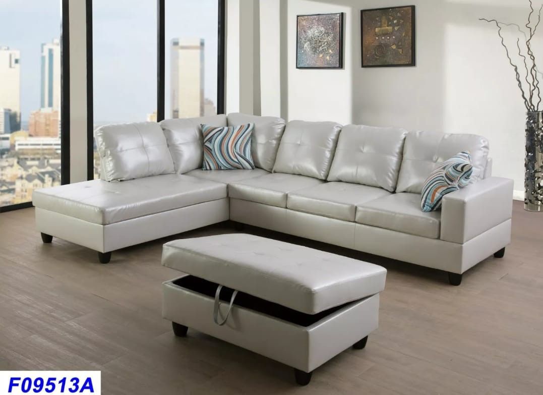 Brand New still in the box , Set includes a sectional sofa, storage ottoman and 2 free decorative pillows. Dimensions are : 102"Length 76"Width 35" Height Free set up Free delivery local área.