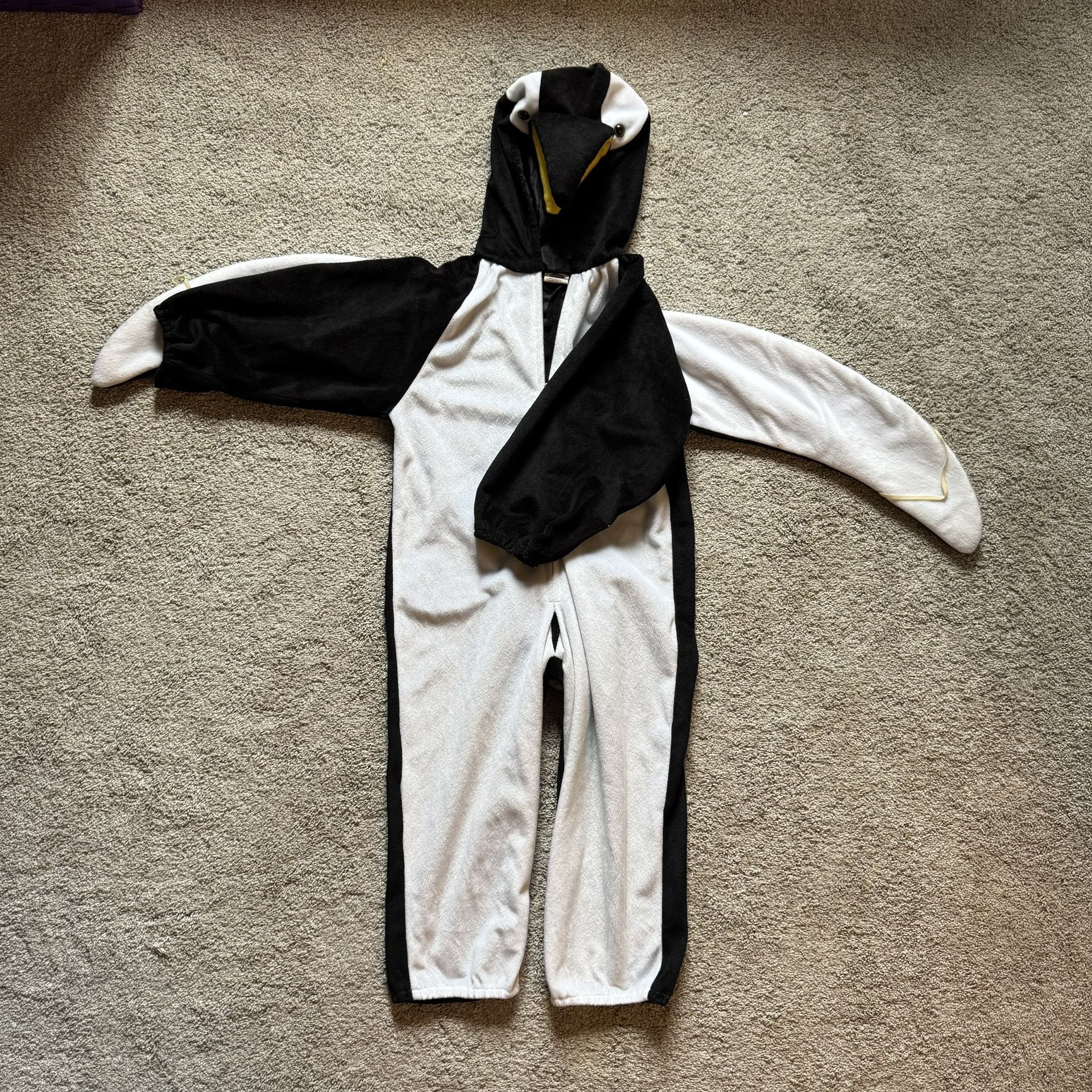 1 for $10 or 2 for $16 penguin full-body suits for kids Wings attachable to arms with rubber band Stuffed beak and tail Zipper up the front Dress Up America brand Size S(4-6) 100% polyester, machine washable Some minor blemishes from being loved