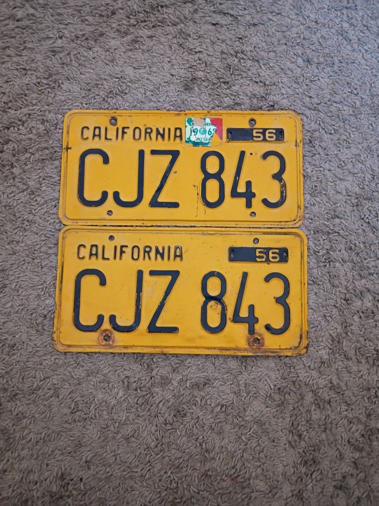 Good condition 1956 California license plate. Pair