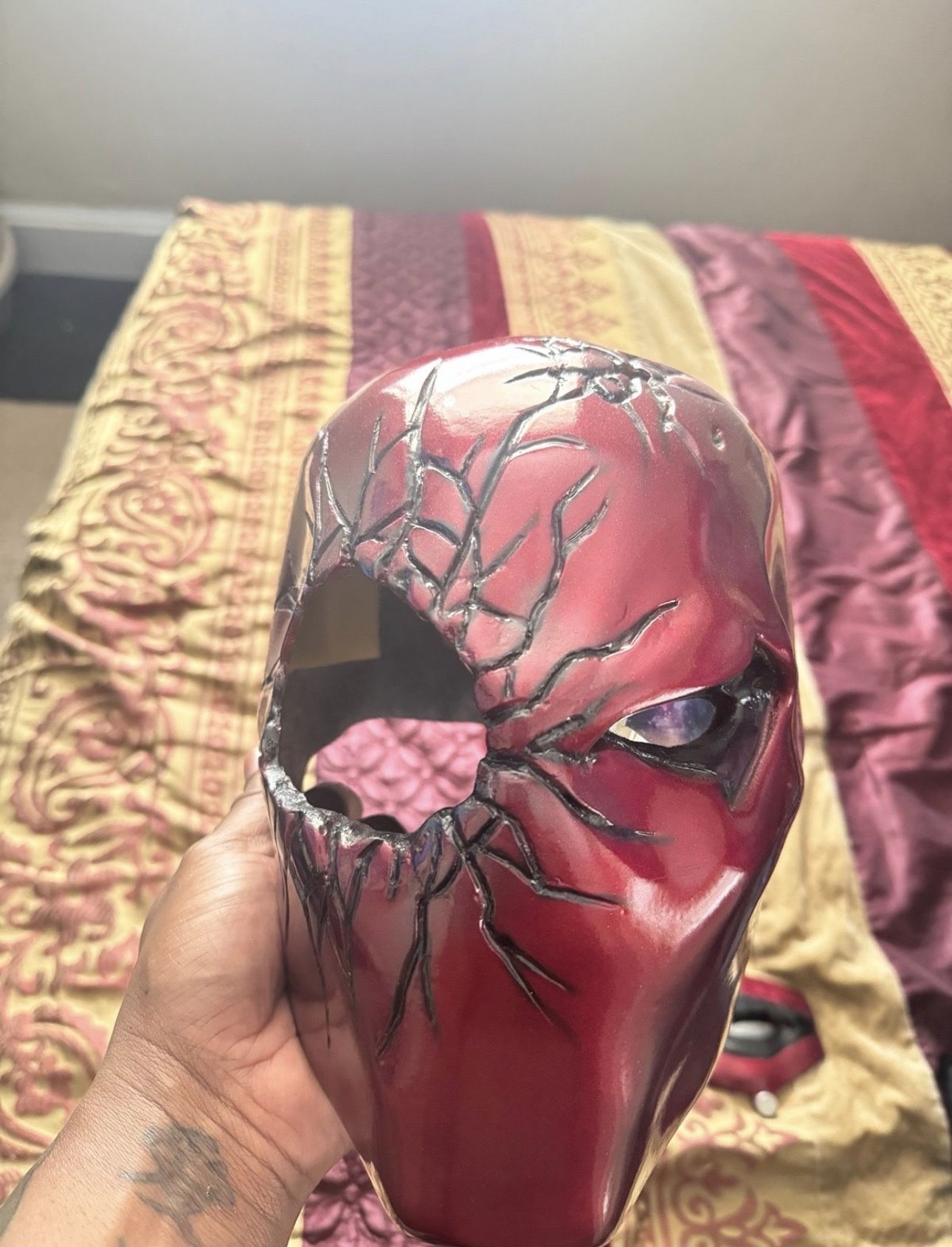 Selling one of my RedHood helmets that I don't wear much. Only been worn to one con and never wore this one again. Part of the eye section is removable and held by magnets has foam padding inside to fit to my comfort level but feel free to add or remove padding as you please to your liking. The helmet is in good condition and only needs a magnet glued back in place.