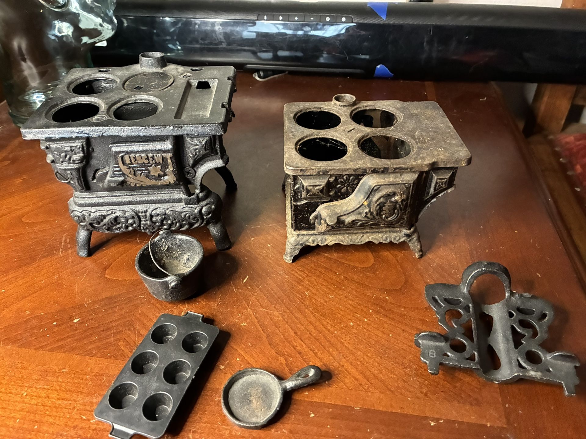 Lot Of 2 Antique Crescent Cast Iron Cook Stove Salesman Sample - Incomplete