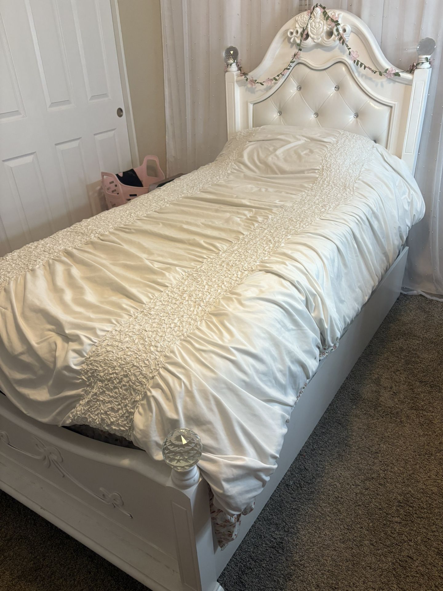 -Comes with only one mattress -Comes with sheets -Comes with bunkie board - Comes with pillow case (does not come with a pillow) -Comes with extra space on the bottom for another mattress -Original price 1,500 -Only had for a few months Beautiful twin-size bed set in excellent condition. This bed features a stunning white upholstered headboard with diamond-tufted crystal accents and a decorative floral crown detail, giving it a classy, princess-style look. Perfect for a child, teen, or guest room. 🛏 Includes: • Sturdy white twin bed frame with crystal finials • Plush twin mattress with elegant quilted pattern • Clean, well-maintained, and gently used 🌸 Design Details: • Soft white faux-leather upholstery • Sparkling crystal buttons and knobs • Feminine, elegant aesthetic that brightens any room 📏 Size: Twin 🏠 Condition: Very good / like new 🚭 Smoke-free home This bed is both comfortable and stylish, offering great support while adding a charming touch to any bedroom. 💬 Message me if you’re interested or would like to see it in person!