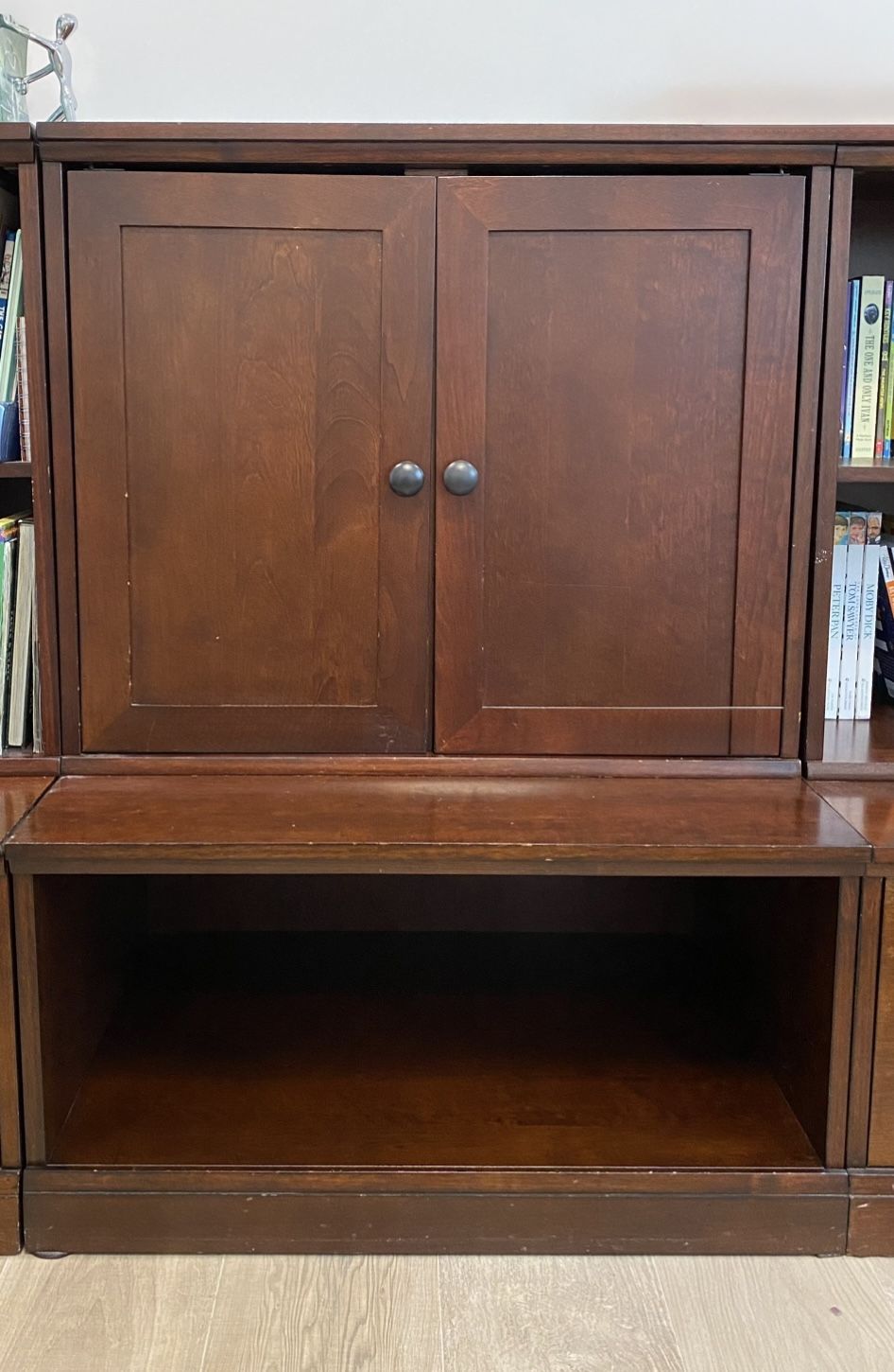 This modular can be sold with the Cameron Open Base ($50). Inside there is a shelf with approx dimensions: 22.25” Wide x 14” Deep x 0.75” Thick The Cameron Collection has clean simple lines and is a classic piece from Pottery Barn Kids Furniture. The color is Sun Valley Espresso. Cabinet with Doors ($30) Dimensions (approx): 29.5”. Wide x 14”” Deep x 24.5” High Cameron Open Base ($50) Dimensions (approx.): 29.5” wide x 20.5” Deep x 15.5” high