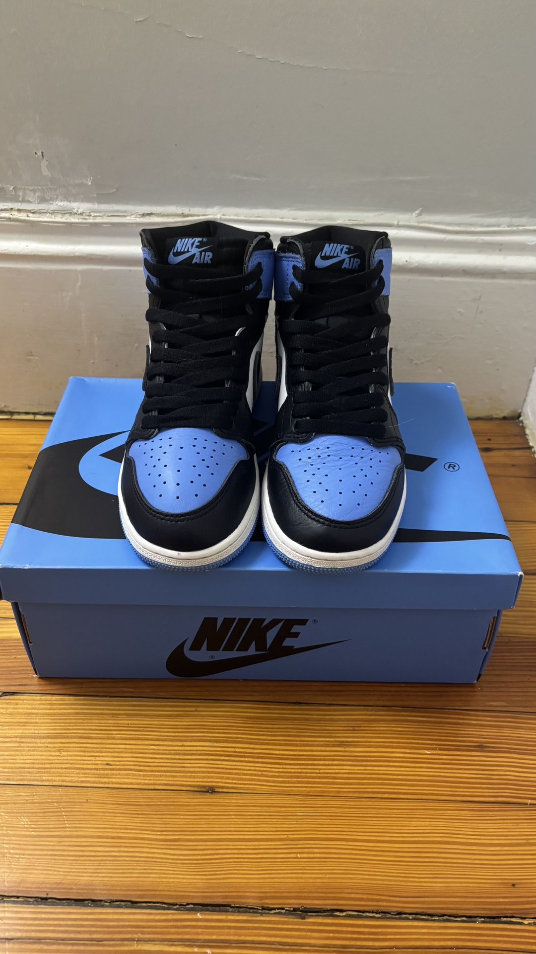 Nike Air Jordan 1 Retro High OG UNC TOE (GS) sneakers in the University Blue/Black-White colorway.