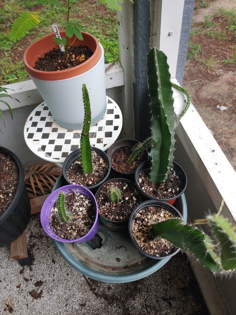 Various sizes of dragonfruit plants. Bigger over 5 years old and with proper care will be close to fruiting.
