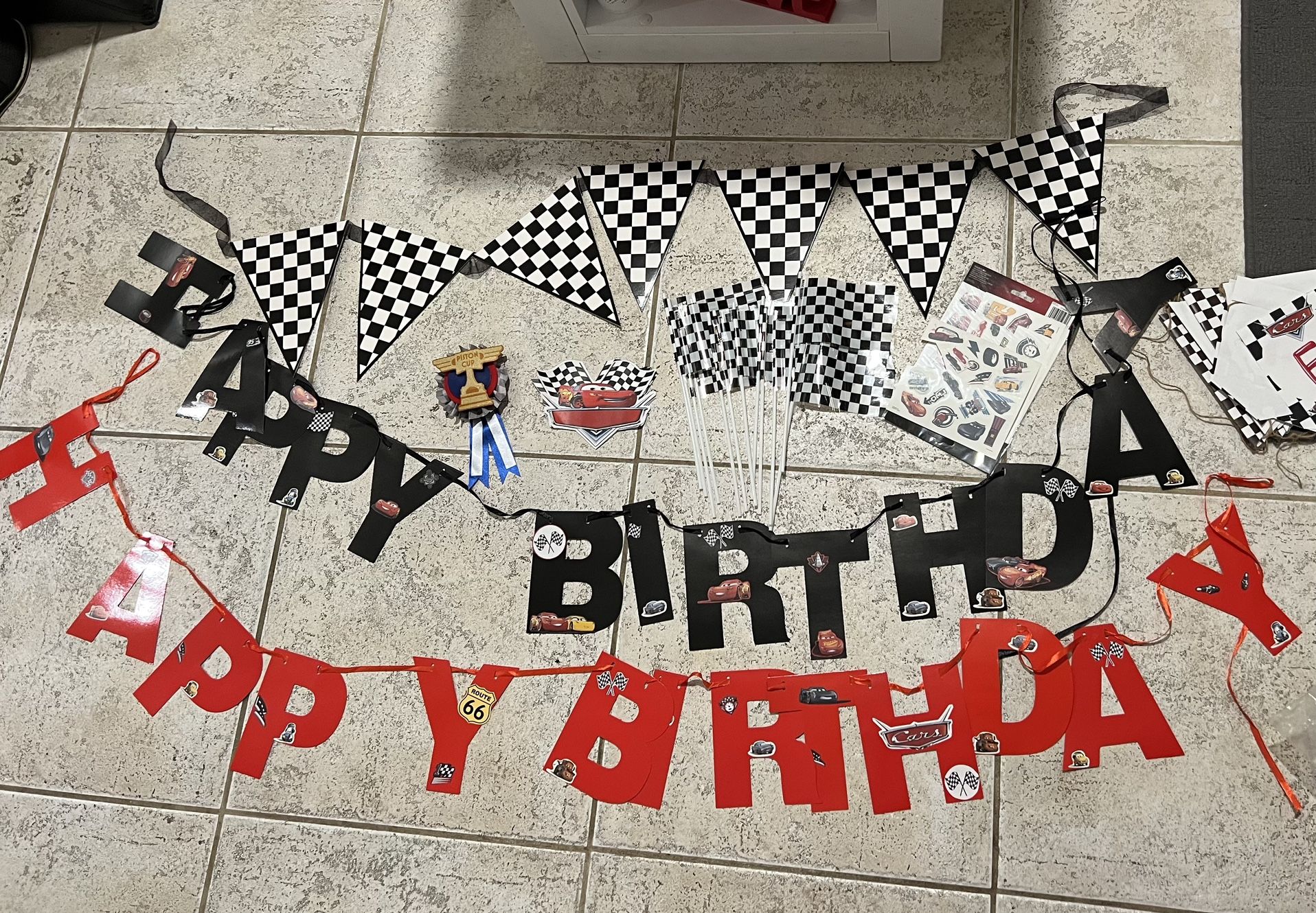 Happy Birthday banners, checker flags, tattoos and 2 large Happy Birthday backdrop etc.. (Disney Lightning McQueen)