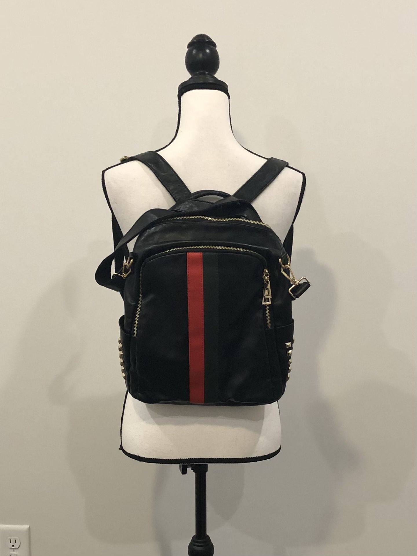 Trendy backpack handbag. Black with gold toned hardware. Green and red stripe down the front. Soft faux leather. Large front pocket. Main compartment has pockets inside. Side pockets. Back zip pocket. Adjustable straps, as well as adjustable shoulder strap. Measures about 12”x12”x5.5”. 2