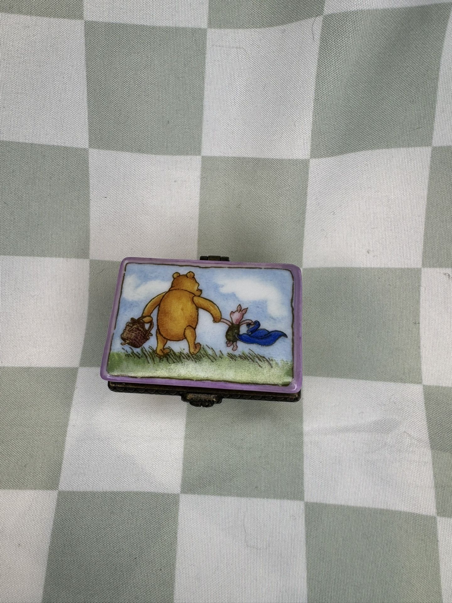 Adorable Disney Winnie the Pooh trinket box featuring Pooh and Piglet walking together holding hands. Designed by Midwest of Cannon Falls. Details: • Porcelain hinged trinket box • Purple lid with Pooh & Piglet illustration • Decorative metal trim and clasp • Gold-tone ball feet • Disney marked on bottom • Opens and closes securely Bottom is stamped: © Disney Designed by Midwest of Cannon Falls Side text reads part of the quote: “It didn’t matter where they went as long as they went together” Condition: Preowned in very good condition. No cracks or chips observed. Light wear consistent with age. Clasp functions properly. Please review all photos for exact condition. Perfect for Disney collectors, Winnie the Pooh fans, or as a sweet keepsake box.
