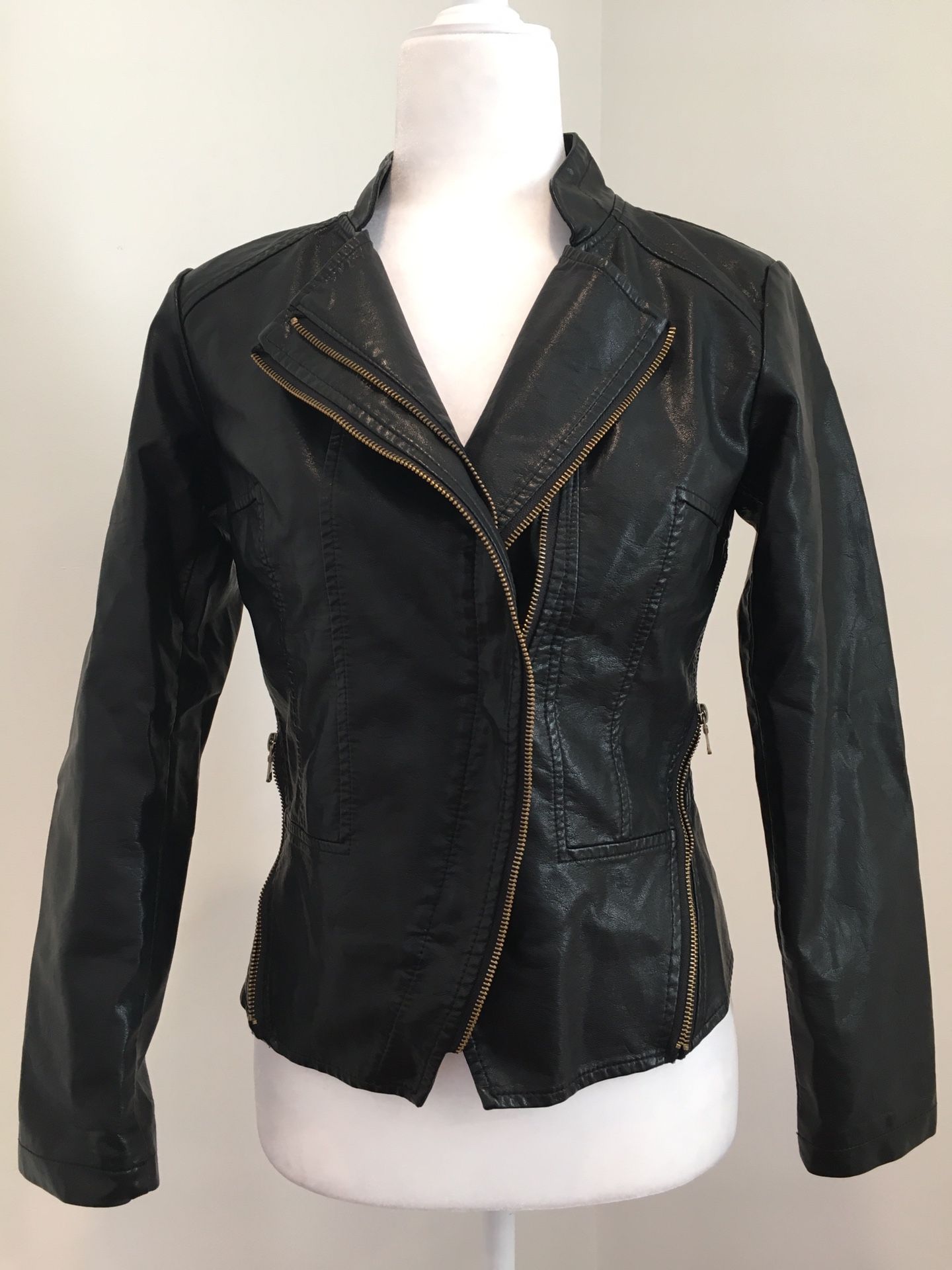 Brand new, never used women’s Black slim faux leather moto jacket. Size is XS but can fit up to size Small. Shoulder 14.56”. Length 21.25”. Sleeve length 23.22”.