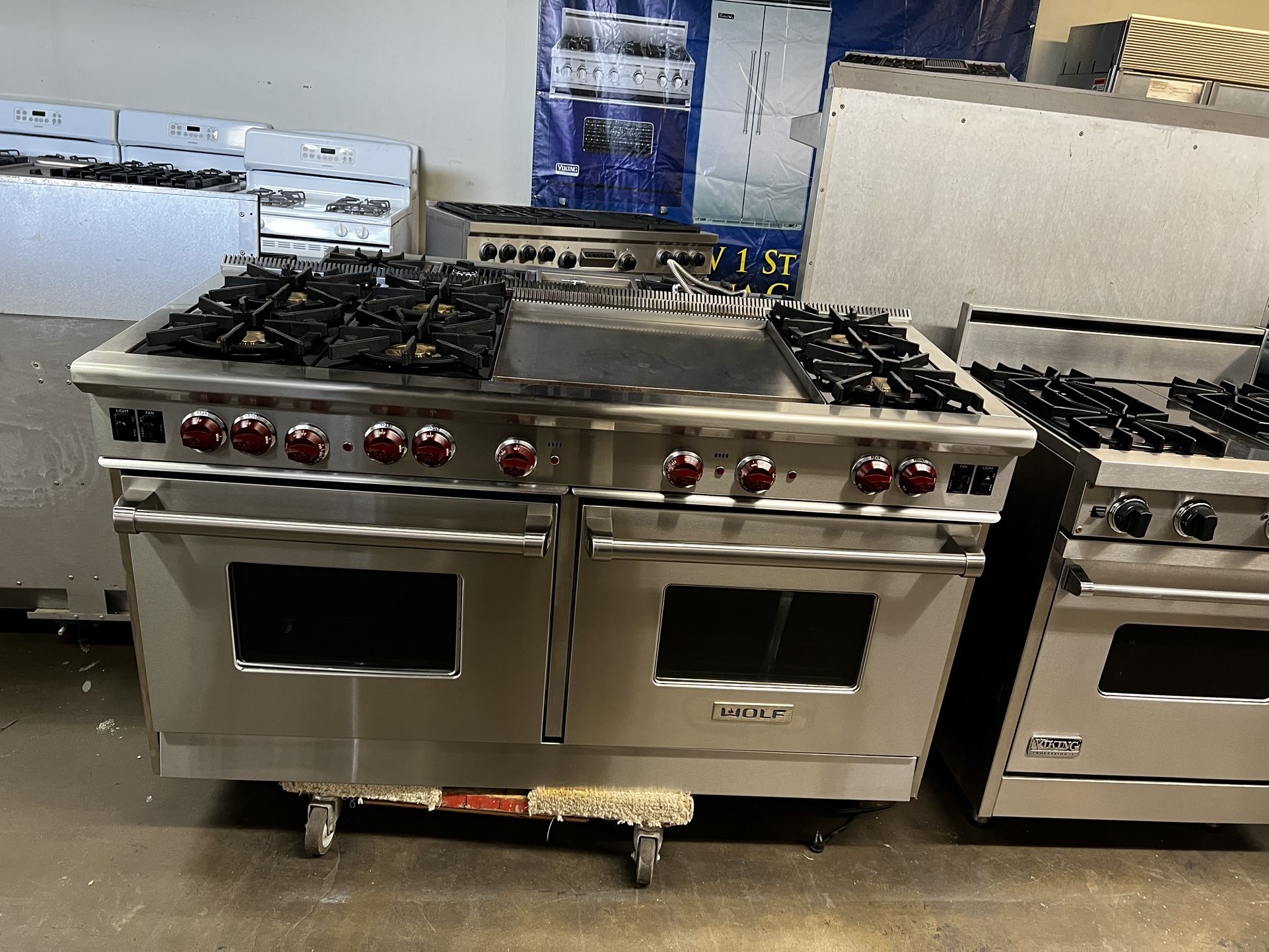 WOLF 60”WIDE ALL GAS RANGE STOVE STAINLESS STEEL WITH 24”GRIDDLE FULLY TESTED AND REVIEWED BY OUR TECHNICIANS FULLY WORKING NO ISSUES DELIVERY IN HOME INSTALLATION HAUL AWAY IS AVAILABLE WARRANTY IS INCLUDED FINANCING WITH SNAP FINANCE AVAILABLE FOR IN PERSON VIEWING! IN THE KITCHEN APPLIANCES