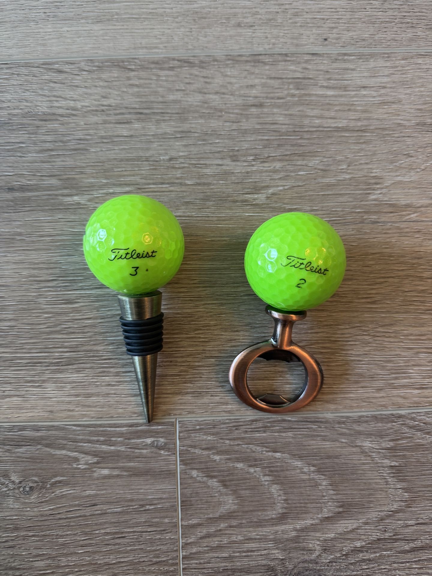 Golf ball metal beer bottle opener and wine stopper. Titleist tour soft green balls. Awesome Christmas gift