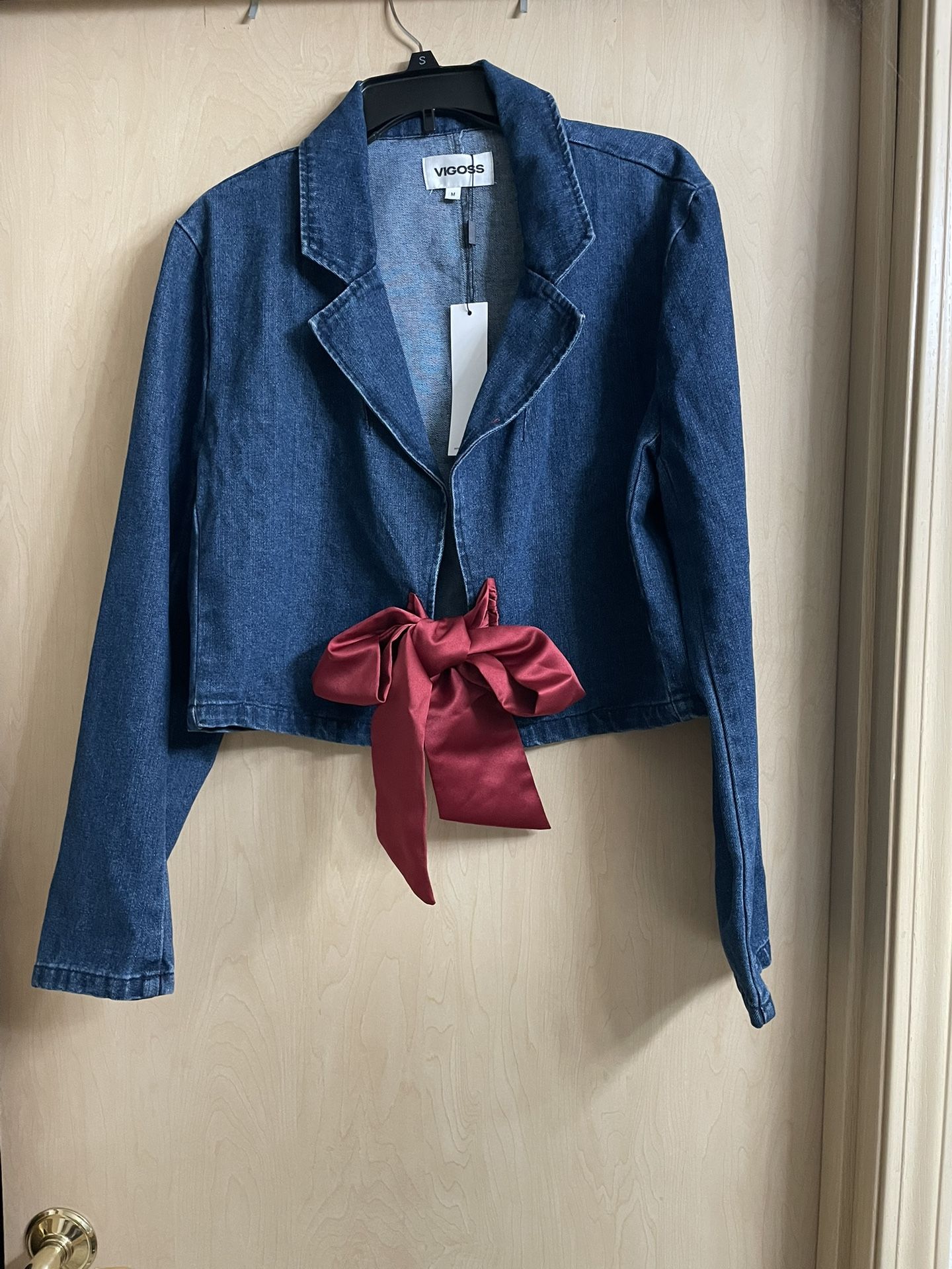 Brand New Size Medium Women’s Denim Jacket w/ Burgandy Tie. Never been worn