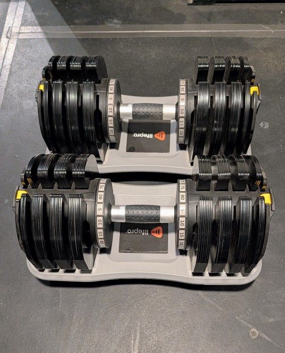 PowerFlow Max adjustable dumbbell set. Goes from 5lbs to 80lbs. Works great
