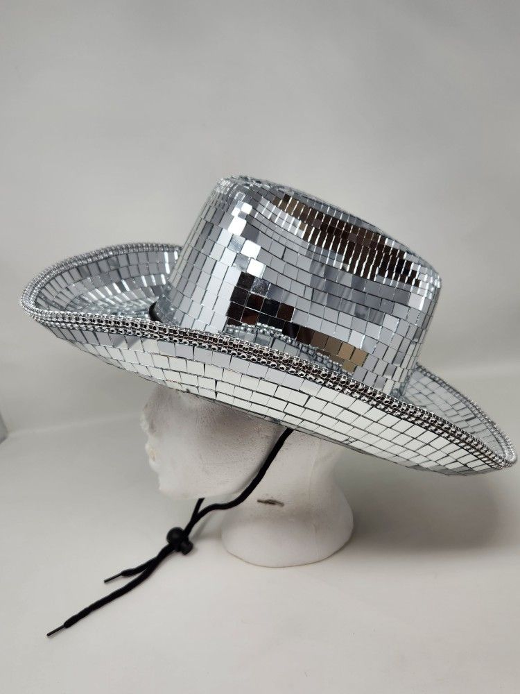 Disco Mirror Ball Western Cowboy Cowgirl Hat Adjustable Strap Concerts, New Year's, Halloween, Dress Up Cosmoplay, or Just Because it's You and you want it No Missing Mirrors Excellent Condition 15"× 13" 23" Inside