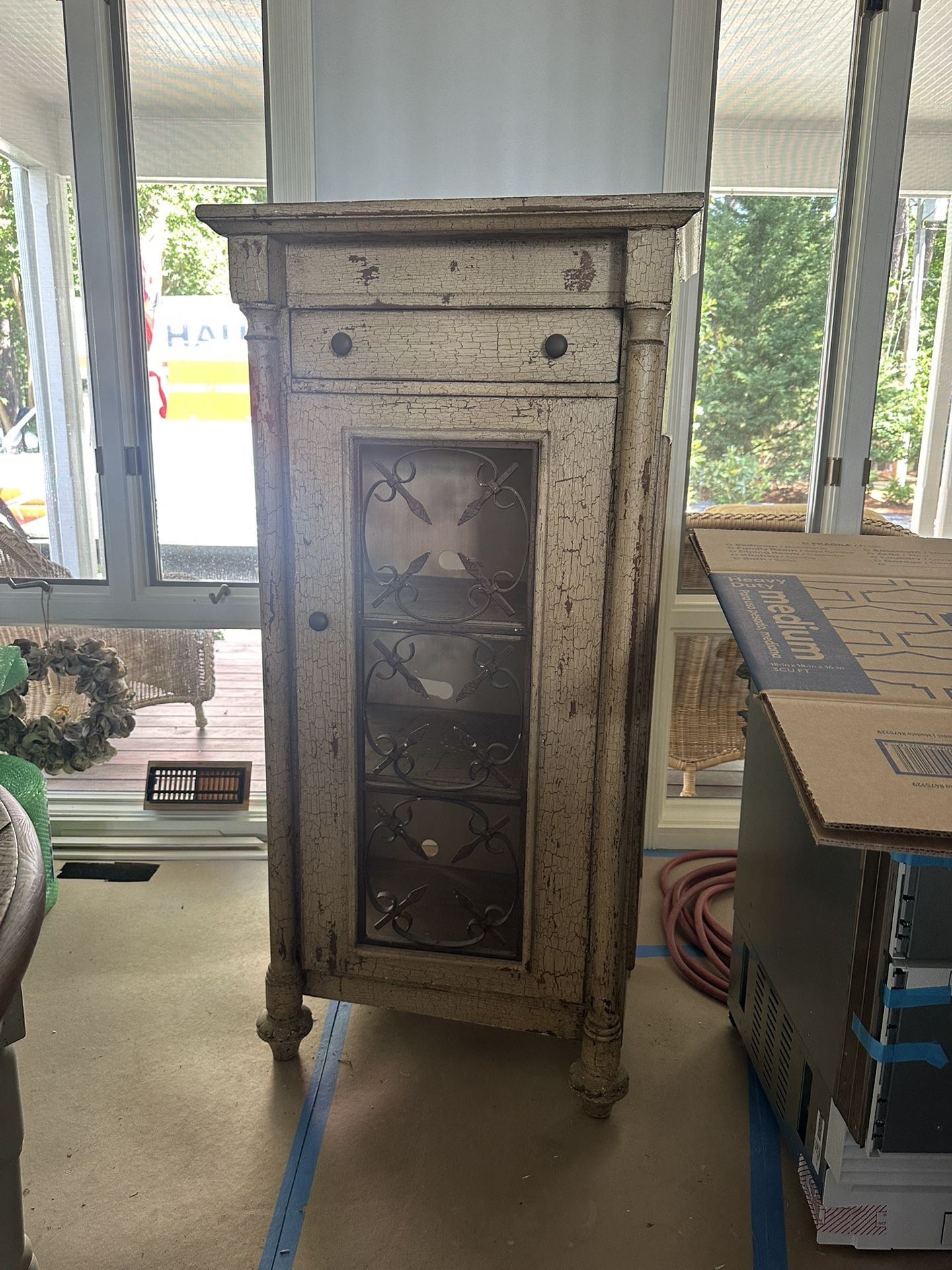 Distressed olive / brown crackled painted cabinet. 2 drawers on top. One door below. Open front with metal detail.