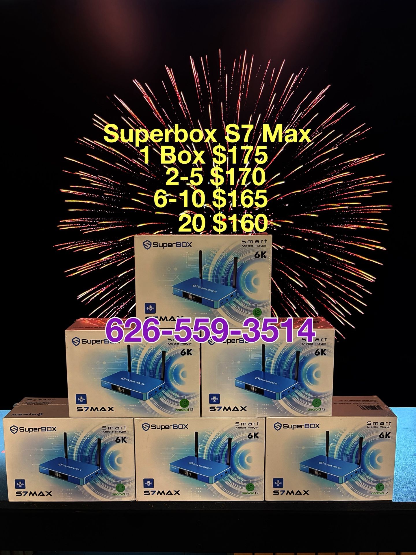 1934 E Colorado Blvd, Pasadena CA 91107 Business hours are 12-7 pm Blackbox new for 2026! 1 box $195 2-5 box’s $190 6-10 box’s $180 20 box’s $170 ‼️ VSEEBOX V6 PLUS ‼️ 1 box $235 2-5 box's $230 6-10 box's $220 20 Box's $210 ‼️ VSEEBOX V6 MAX ‼️ 1 box $195 2-5 box's $190 6-10box's $180 20 box's $170 ‼️VSEEBOX ELITE MINI ‼️ 1 BOX $235 Wholesale $220 ‼️VSEEBOX ELITE ULTRA‼️ 1 BOX $295 ‼️S6 PRO‼️ 1 BOX $130 2-4 BOXES $125 5-9 BOXES $120 10 BOXES $115 20 BOXES $110 ‼️S6 MAX‼️ 1 BOXES $150 2-4 BOXES $145 5-9 BOXES $140 10 BOXES $135 20 BOXES $130 ‼️S7 PRO ‼️ 1 BOX $165 2-5 BOXES $160 6-10 BOXES $150 20 BOXES $145 ‼️S7 MAX‼️ 1 box $175 2-5 box's $170 6-10 box's $165 10 box's $160 ‼️S7 ULTRA‼️ 1 box $185 2-5 box’s $180 6-10 box’s $175 20 box’s $170 ‼️ SUPERBOX SUPREME ‼️ PRICE $300 ⭐️MESSAGE FOR WHOLESALE PRICE⭐️ AUTHORIZED WHOLESALE DISTRIBUTORS 1 YEAR WARRANTY 24/7 TECH SUPPORT BRAND NEW SEALED PRODUCT