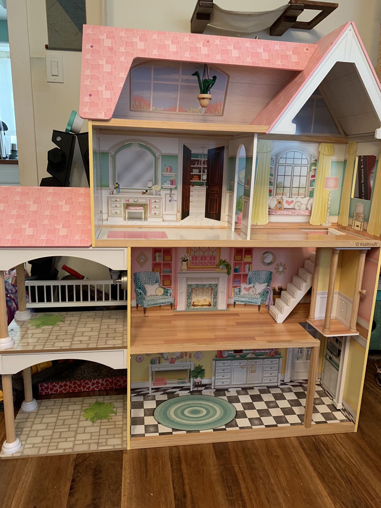 Large little girls dollhouse for sale. It is a 3-story dollhouse with a loft, an elevator, deck, and just some of the furniture. Very sturdy and in very good shape. The dimensions are 12” deep, 52” tall, and 48” long. Our girls had lots of fun with it and it’s time to pass it on to some new caretakers. Let me know if you have other questions, thanks.