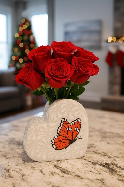 Bring a touch of Mexican folk-art charm into your home with this beautifully crafted Talavera heart-shaped flower vase. Featuring a raised floral texture and a vibrant hand-painted monarch butterfly, this piece adds warmth, color, and meaning to any space—perfect for fresh blooms, dried flowers, or as a decorative accent all on its own. ⸻ 🌸 Features • Hand-crafted Talavera ceramic • Heart-shaped design with embossed floral details • Bright orange monarch butterfly artwork • Perfect size for small flower arrangements or decorative styling • A thoughtful gift for birthdays, housewarmings, anniversaries, or nature lovers Each piece is 100% lead free, ensuring safe, high-quality craftsmanship you can trust. At Luz del Alma, we take pride in offering pieces that not only elevate your décor but also deliver exceptional care, attention, and service to our clients—your satisfaction is always at the heart of what we do. ✨ Please Note: Because each vase is individually handmade, no two pieces will ever be exactly alike. Slight variations in color, pattern placement, texture and minor imperfections which are natural and add to the authentic beauty of the artwork.