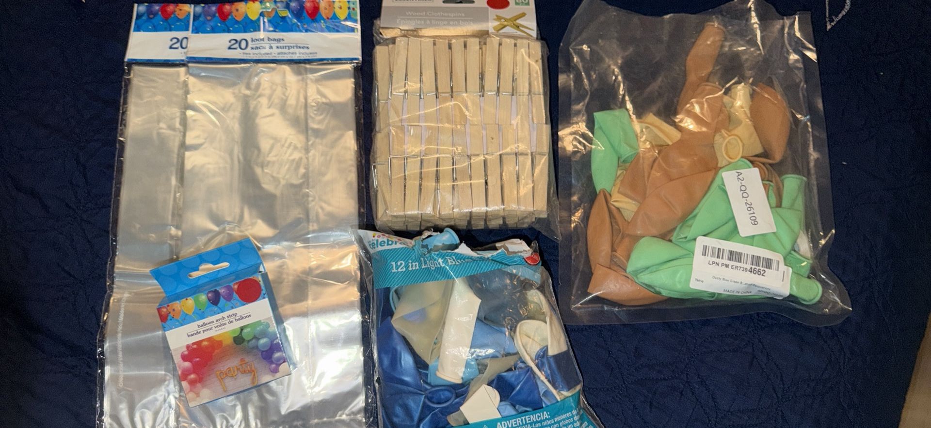 Balloons Variety color Blues/Browns Clothes Pins 60 count Balloon Arch Strip 2x 20 piece candy bags.