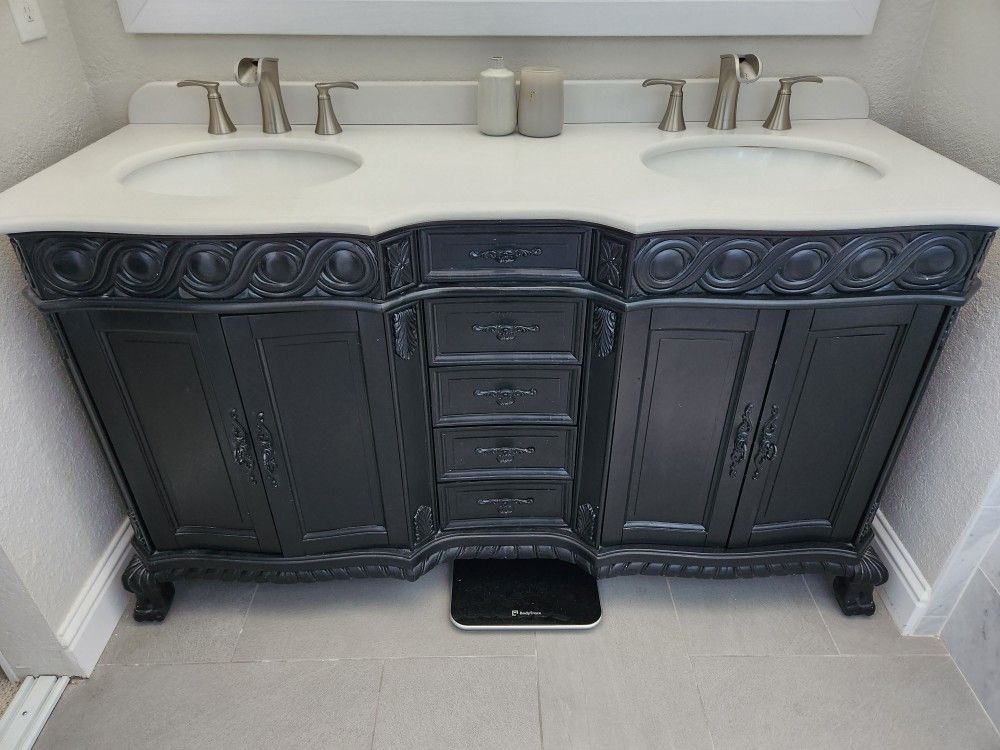Black Ornate Vanity with Stone Top. Come with faucets OBO