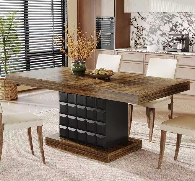 F2120 63'' Dining Table for 4-6, Farmhouse Wooden Rectangular Dinner Table with Geometric Relief, Pedestal Base (Brown and Black)