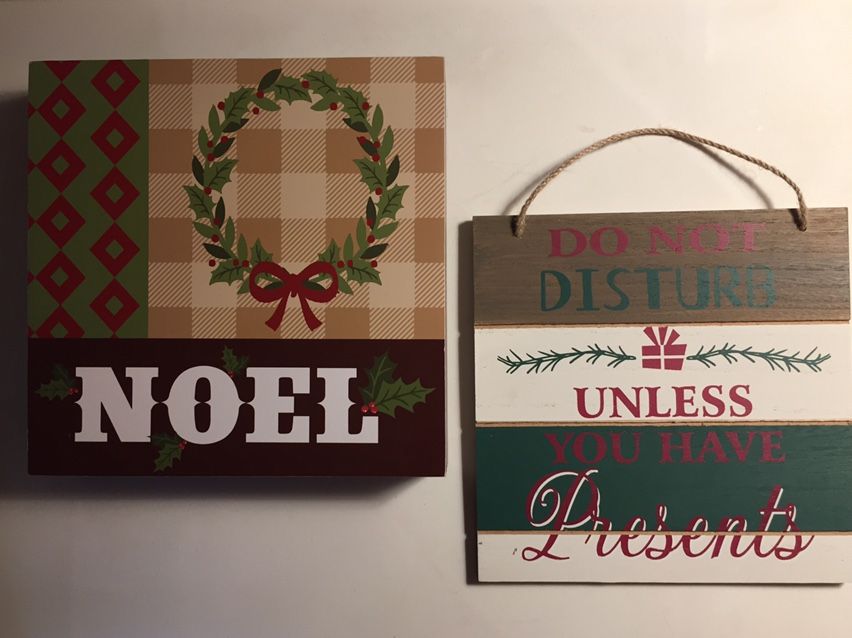 5 New Christmas Signs. Wood composite. 1) Noel 2) Do Not Disturb Unless You Have Presents 3) Baby It’s Cold Outside 4) Unless Your Name Is Santa Don’t Knock 5) Better Not Pout $3.00 each or $13.00 for all 5. Cash only. Local pickup.