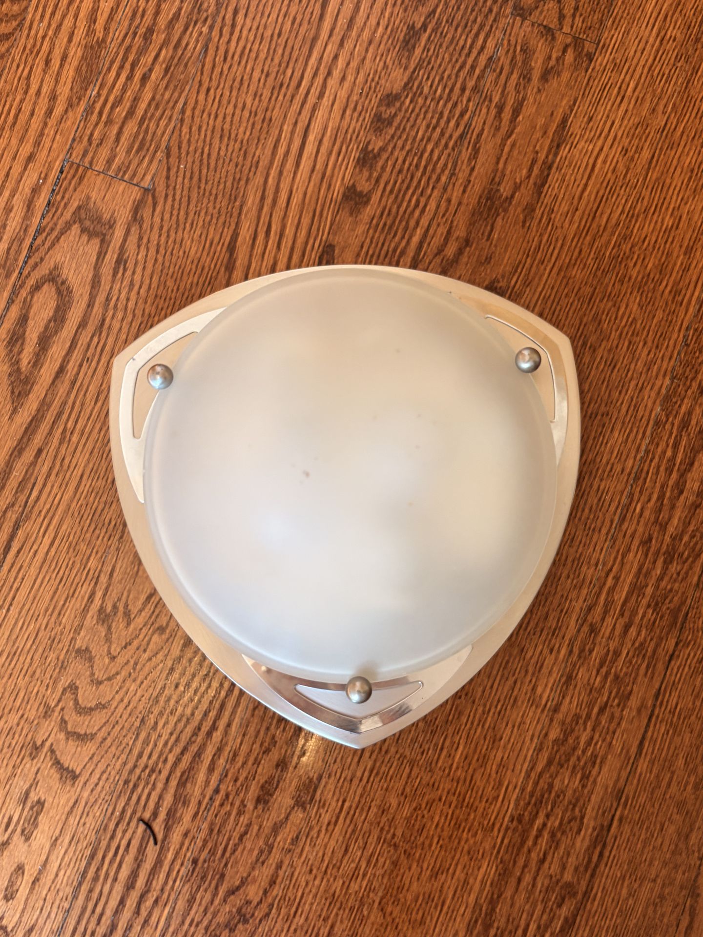 Sleek modern ceiling light with a stylish triangular design Durable metal frame with frosted glass dome shade Easy to install with all mounting hardware included Used bulb can be included if needed Cash or Venmo Only