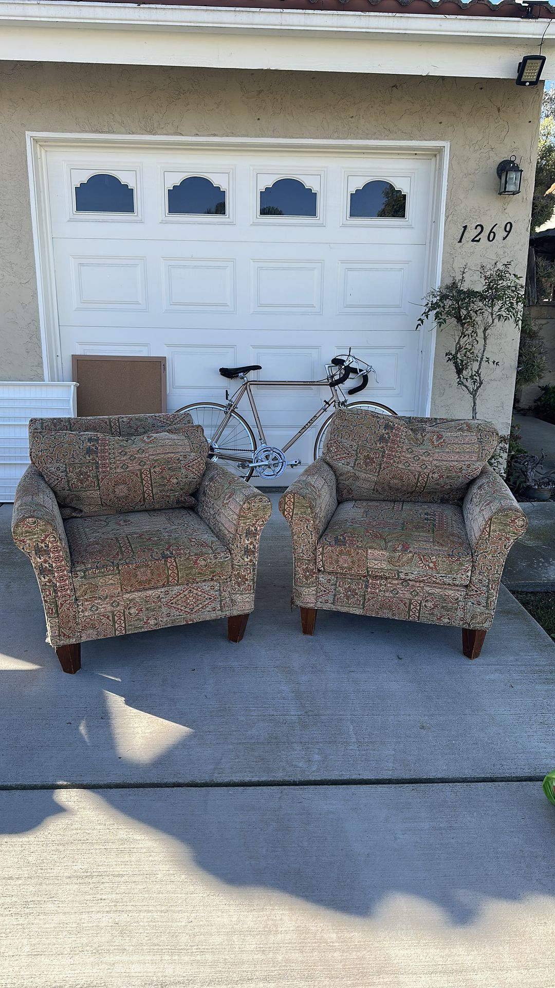 Set of two upholstered armchairs with patterned tapestry fabric. Solid and comfortable with wood legs. Nice size for living room or office seating. Selling both together.