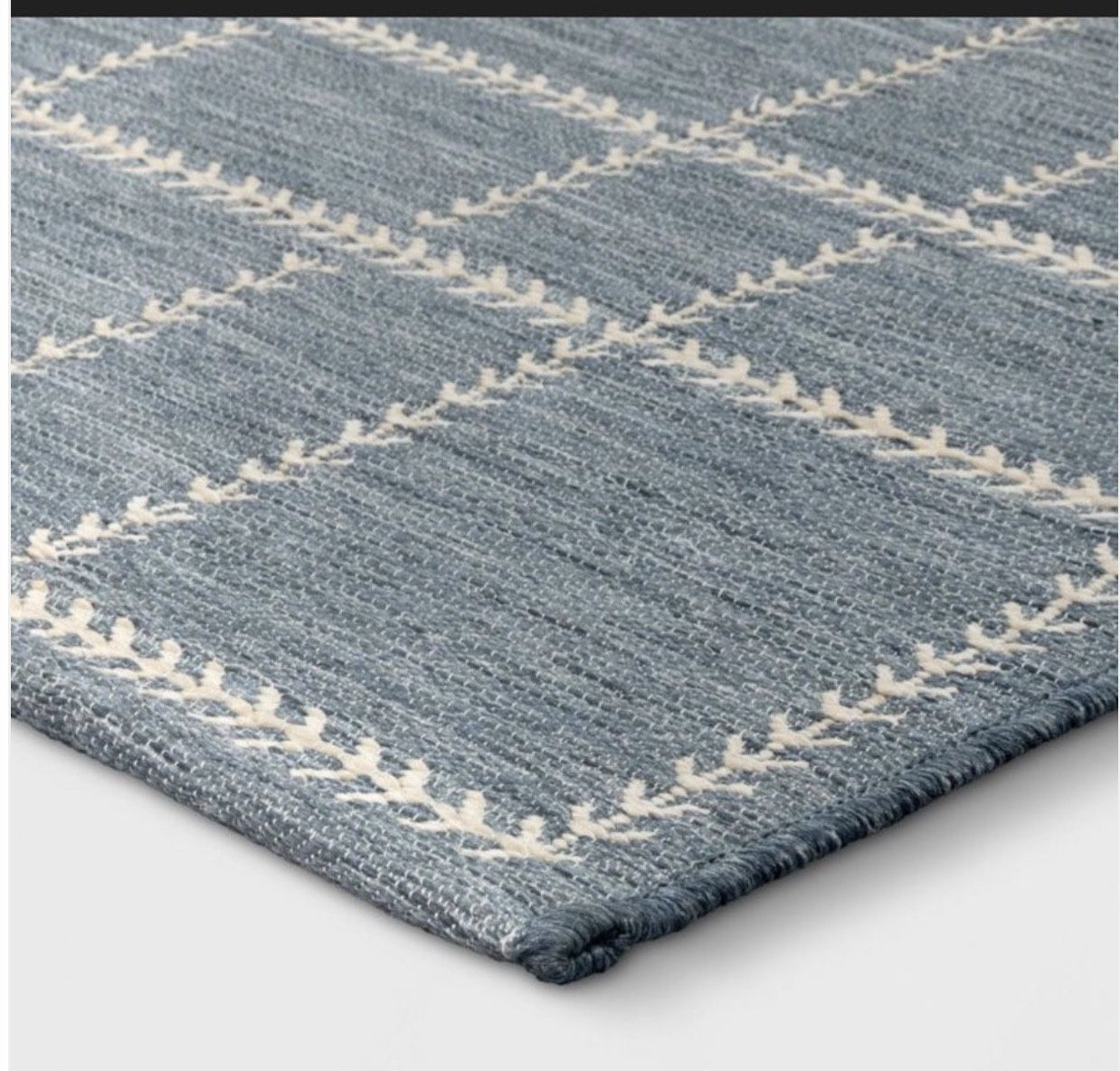 New not used but open packaging 5'x7' Stitched Grid Woven Outdoor Area Rug Slate Blue Threshold™ designed with Studio McGee Stitched grid outdoor area rug • Polypropylene-blend woven fabric • Latex backing • Flat pile height
