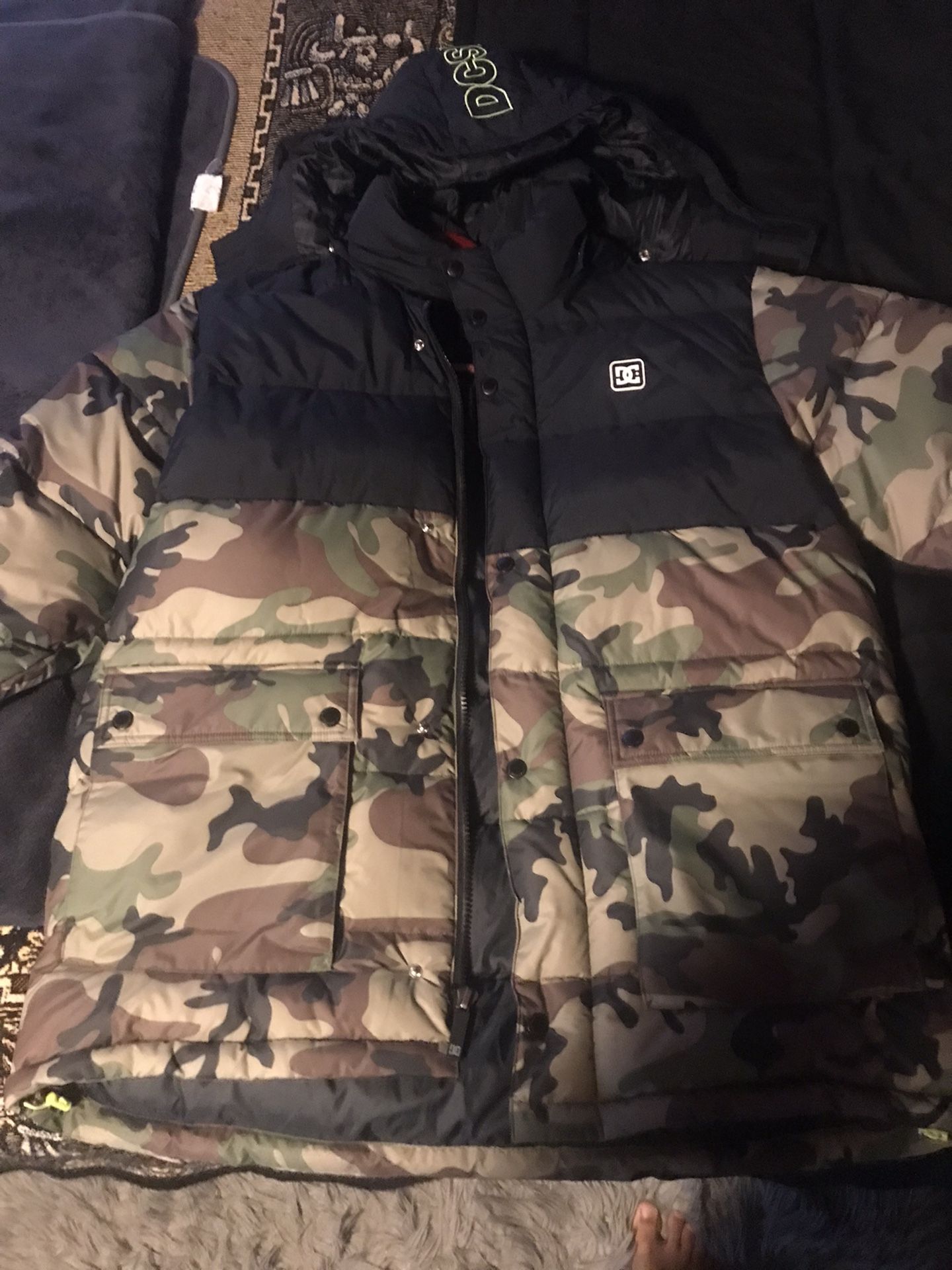 Brand new with tags DC jacket. Has removable hoodie. Super warm. Can be used for snow and hunting or whatever. This jacket is XXL