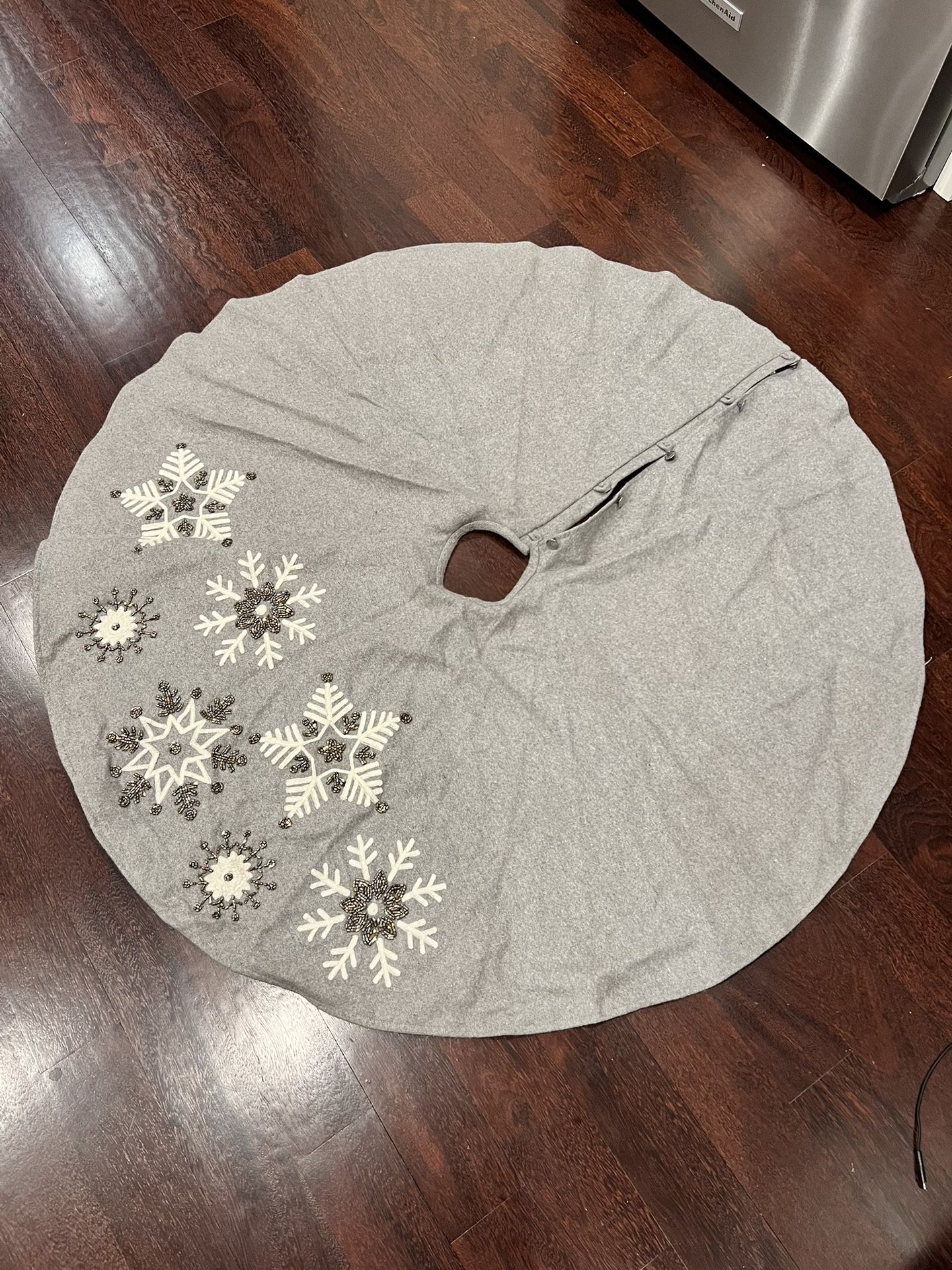 Grey tree skirt with embroidery and beading. 51 inches across.