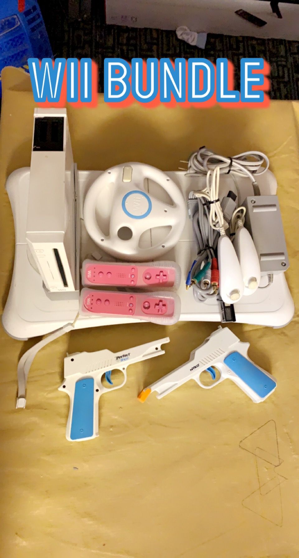 WII HUGE BUNDLE WII CONSOLE TWO PINK CONTROLLER TWO SMALL CONTROLLER TWO GUN SENSOR BAR WHEEL FIT BOARD WITH DISC POWER CORD VIDEO CABLE.