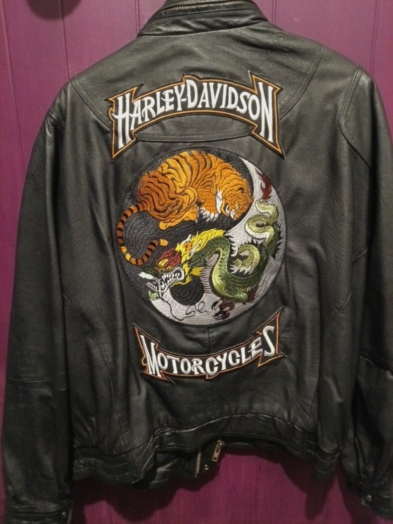Black leather motorcycle jacket non Harley with Harley-Davidson patches size 2XL price $75