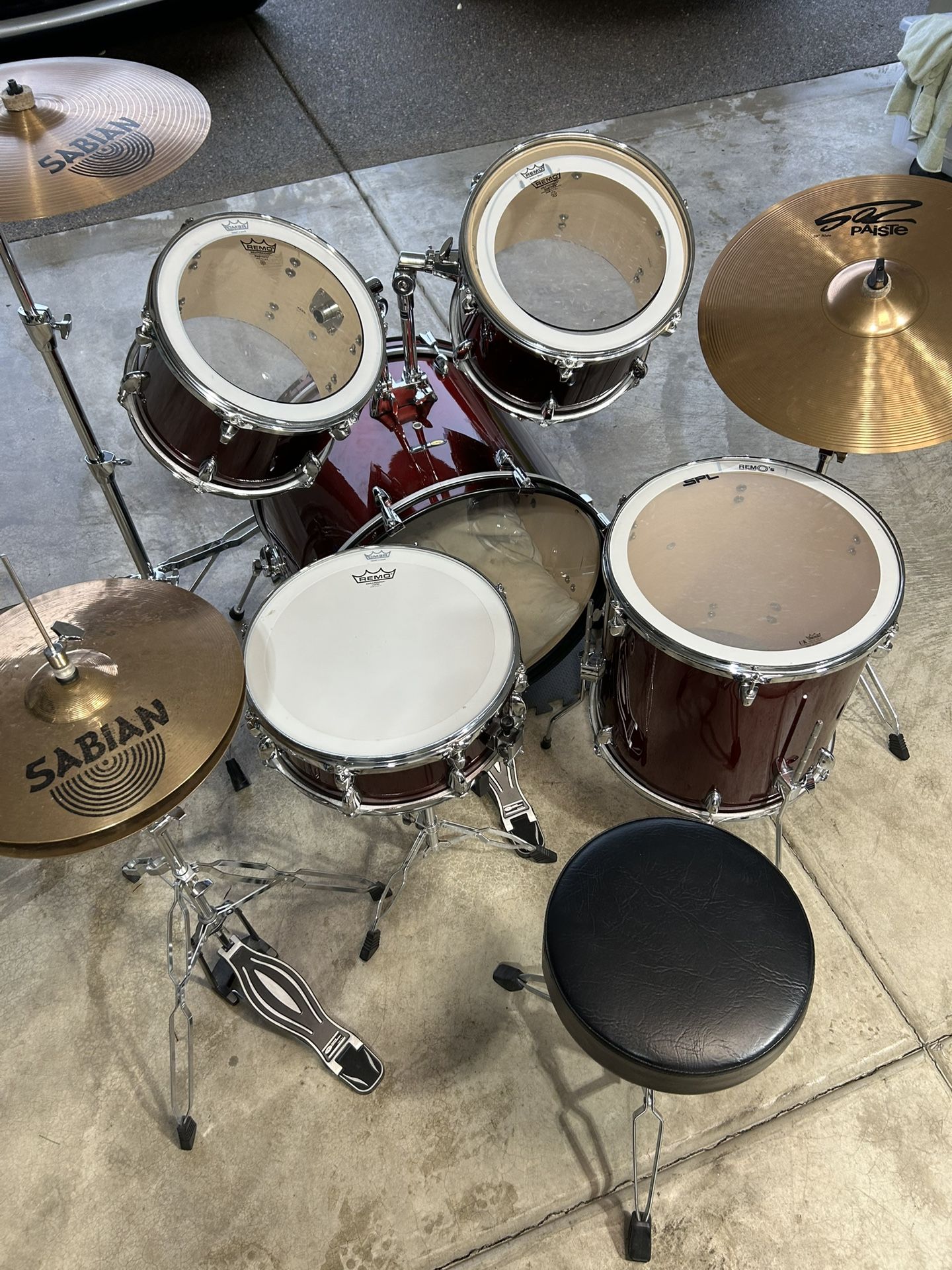 Preowned from child drummer. In very good condition. Remo heads on all drums. Tom heads have stick marks with lots of life left. Brand New Remo Ambassador Coated on snare batter side. New cymbal felts installed. Sizes: 22” bass, Toms 16”,13” and 12”. Snare 14” Cymbals: Paiste 502 Ride Cymbal 20”, Sabian Crash/Ride Cymbal 18”, Sabian B8 Pro Hi Hat Cymbals 14”. Cymbals do not have cracks or keyholes. Hardware is Sound Percussion with Mapex/Tama heavy duty boom cymbal stand to handle 18” cymbal. PDP Throne with no tips or tears. Includes sticks and tuning key. Drums are a maroon color and not mismatched.