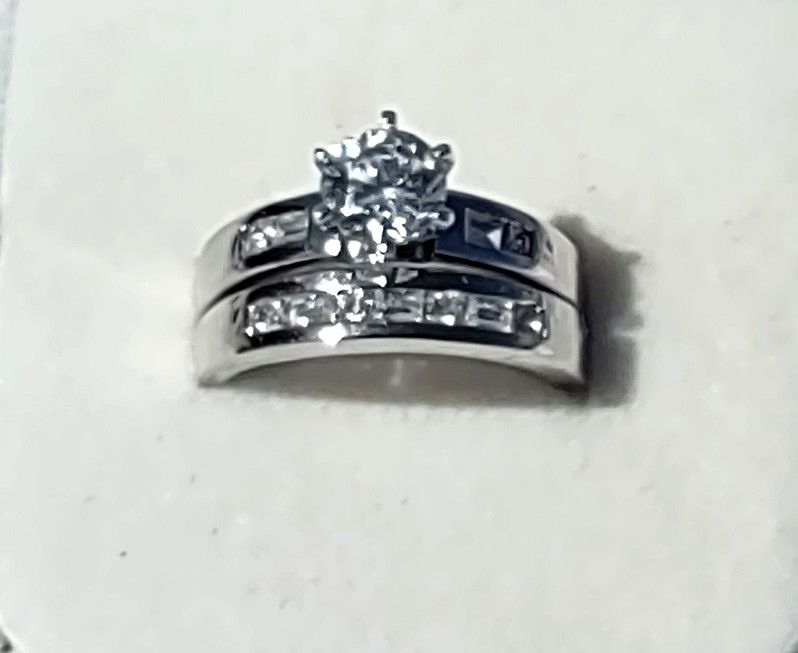 Authentic Sterling silver Wedding & engagement ring set. This set is two rings. With sparkling CZ diamonds. Ring Size 7.5. Stamped 925 and is 92.5% real sterling silver. Shipping is USPS for $4 and it usually takes about 3-6 days shipping time or you can pick up near 35th Ave and Glendale Rd in Phoenix Az.