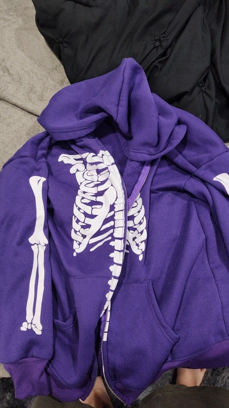 A purple hoodie with white skeleton on the outside not very good quality as y will be cheap size small