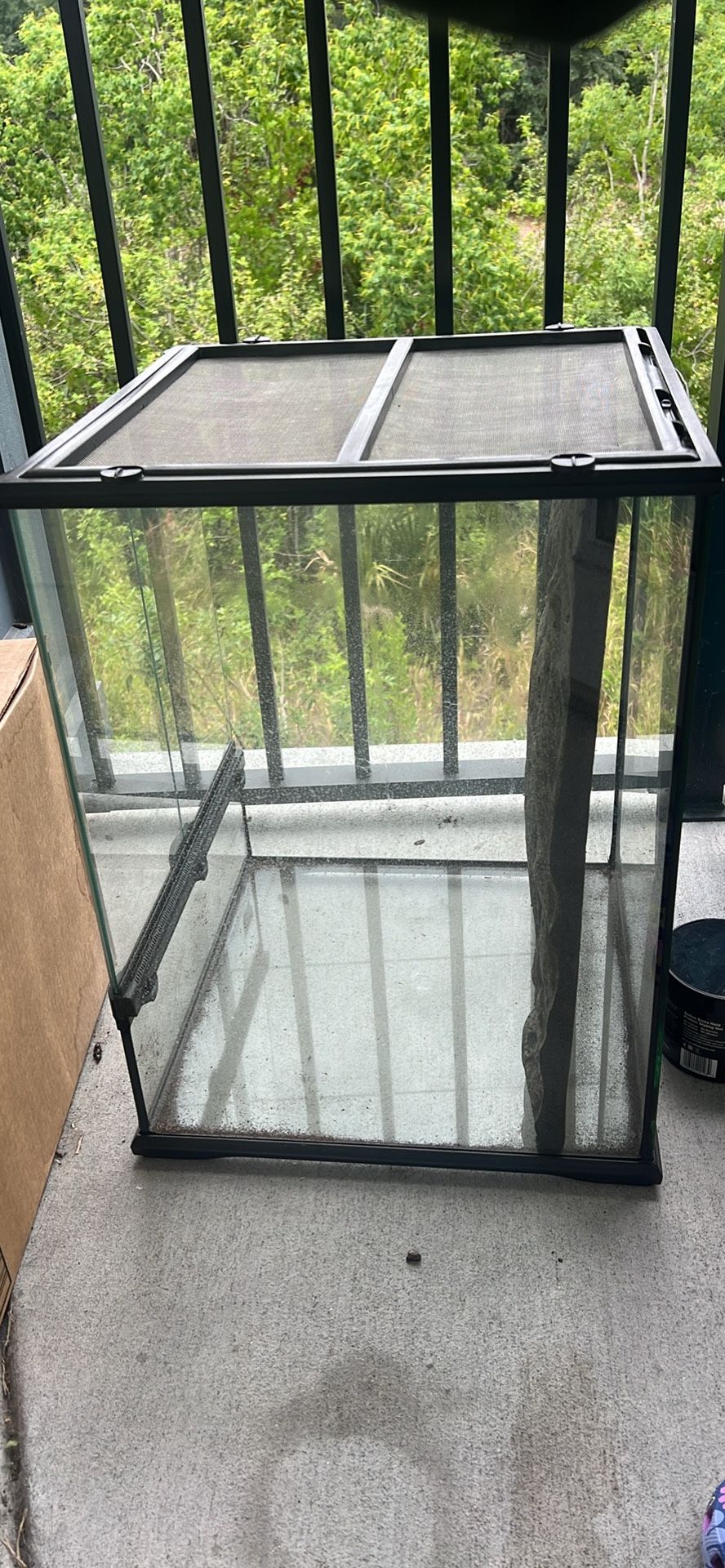 Used for 2 months my pet died :(fantastic condition just dusty. I am also giving away some bark and liners with the tank. Includes original background 24x18x24