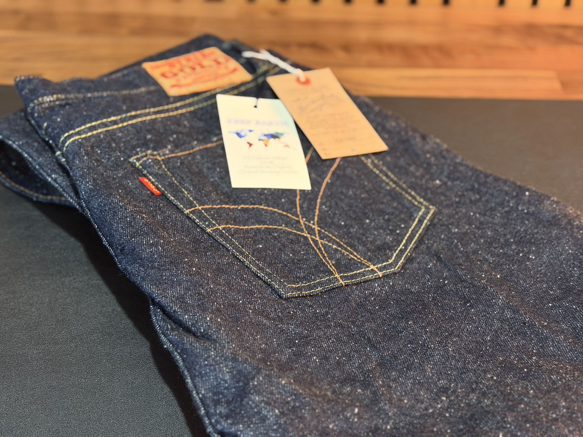 For sale is a rare, environmentally conscious masterpiece from The Strike Gold: the "Keep Earth" series. The Fabric: 17oz Heavyweight Original Selvedge. The warp is 100% Natural Indigo (Aizome) rope-dyed, creating a vibrant, rich blue that is far more brilliant than standard synthetic indigo. The Cotton: Woven from 100% Organic Cotton, giving the interior (weft) a natural beige/brown tint. This unbleached cotton adds warmth to the color and feels softer against the skin. Details: Signature Gold Sparkle Selvedge ID. Iron male rivets (designed to rust) and Copper female rivets. Deerskin leather patch. "Keep Earth" tag attached. Aging Potential: Because it uses Natural Indigo, the fade will be slower and more natural/vintage than the high-contrast synthetic dyes. The Strike Gold SG0103KE