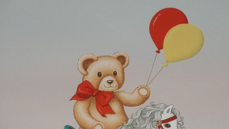 Balloons with Bear on rocking Horse Size 20 x 24 Genuine Original Canvas Lithograph Artist Art